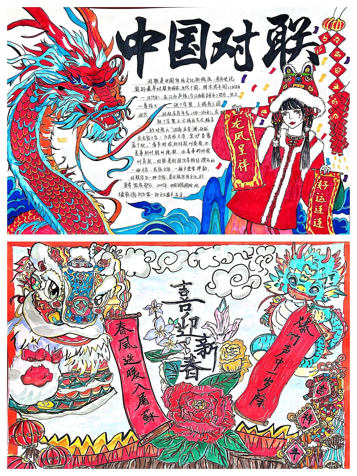 大家热情高涨,纷纷投入到这个具有挑战性和趣味性的活动中。他们不仅精心选择和设计手抄报的版面,还用心挑选和书写每一个字。这种认真和专注的态度,充分展示了他们对传统文化的热爱和尊重。手抄报作品的质量也值得称赞,学生们不仅将传统的对联形式展现得淋漓尽致,还通过手抄报的设计和色彩搭配,赋予了作品新的生命和意义。他们通过自己的理解和感受,将传统与现代相结合,使得手抄报既有传统的韵味,又不失现代的气息。经评比,23旅管二班王九红荣获一等奖,23会计四班张慕涵、23财管二班王天玥荣获二等奖,23旅管二班邹静怡、23会计一班齐亚静、23旅管二班盛音弦荣获三等奖。