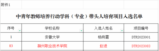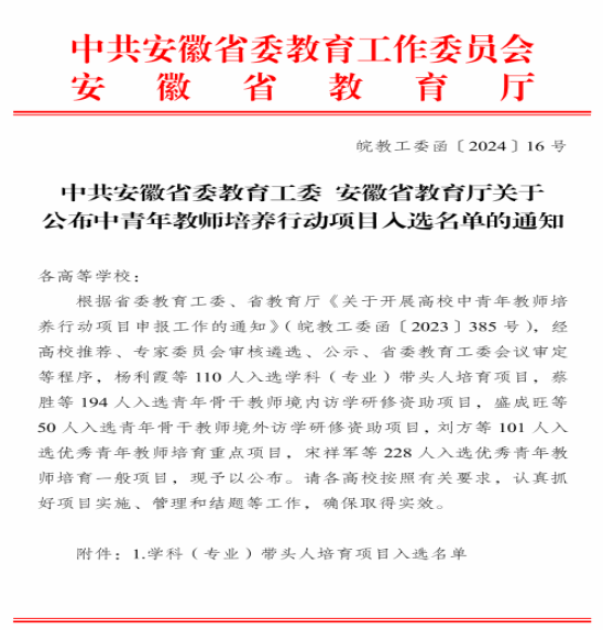 根据《中共安徽省委教育工委 安徽省教育厅关于公布中青年教师培养行动项目入选名单的通知》,2023年度省中青年教师培养行动项目的评审结果正式公布,我院财务会计系主任赵进入选学科(专业)带头人培育项目。