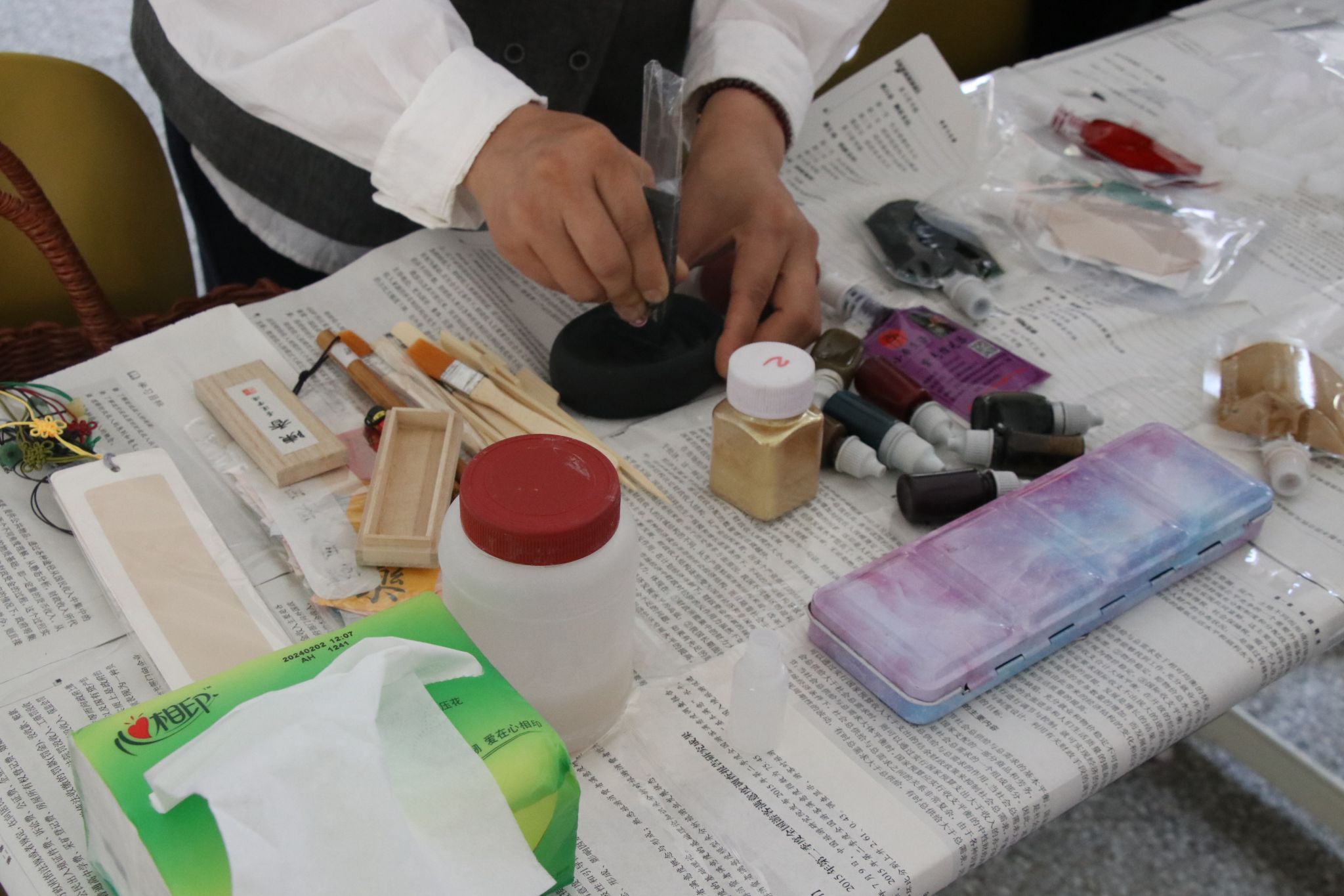 在活动现场,学院特意邀请到安徽省艺术鉴赏学研究会会员车萱穜老师,为师生们展示非物质文化遗产——传统手工漆扇制作工艺。老师首先介绍了漆扇制作的基本材料和工具,接着亲自示范操作流程。大家认真听讲,跃跃欲试,进行颜色调制,并细心绘制图案,精心雕琢每一处细节,让扇面上的图案更加生动逼真。