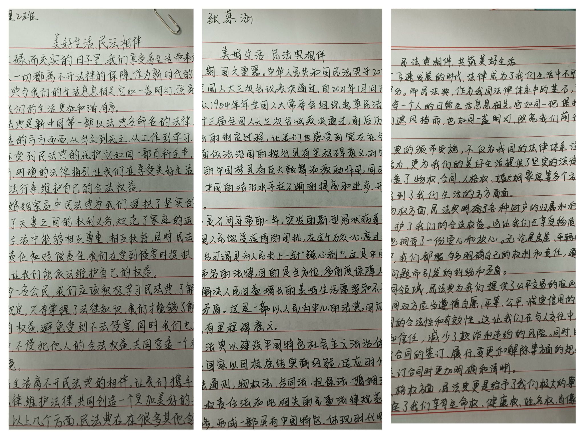 活动中,同学们积极参与,用文字书写自己对民法典的理解和感悟。有的同学从民法典保障公民权益的角度出发,阐述了民法典对维护社会公平正义的重要性;有的同学则通过发生在身边的民法典案例,生动形象地展示了民法典在现实生活中的应用。同学们从不同的角度出发,结合自己的学习和生活实际,深入剖析民法典的重要性和必要性。他们的文章既有深入浅出的法律解读,也有生动活泼的生活实例,充分展示了同学们的法律素养和思维活跃度。