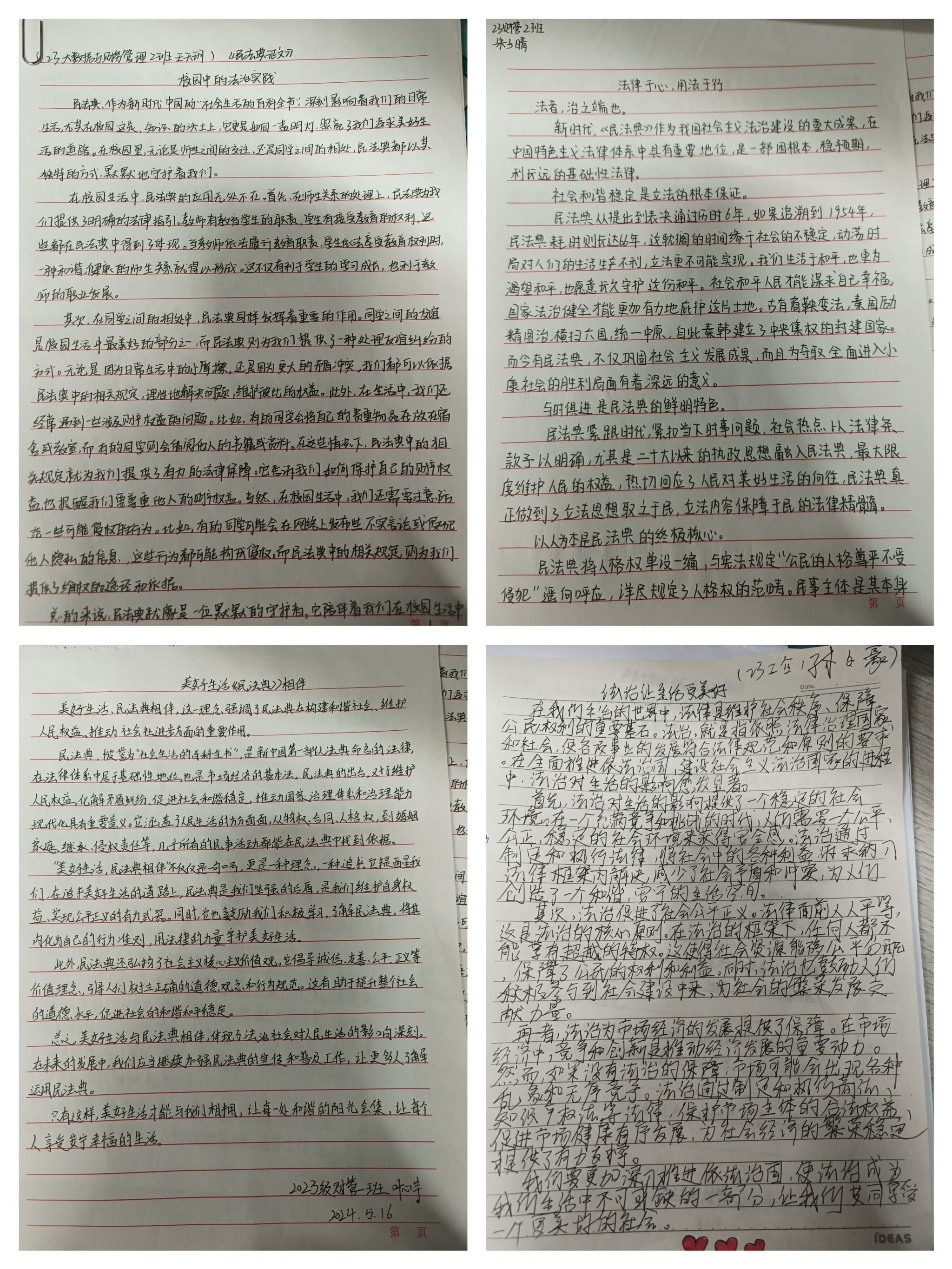 2024年5月16日,管理学院团总支开展“美好生活·民法典相伴”主题征文活动。此次活动旨在让同学们深刻体会民法典在日常生活中的重要作用,共同营造学法、懂法、守法的良好氛围。