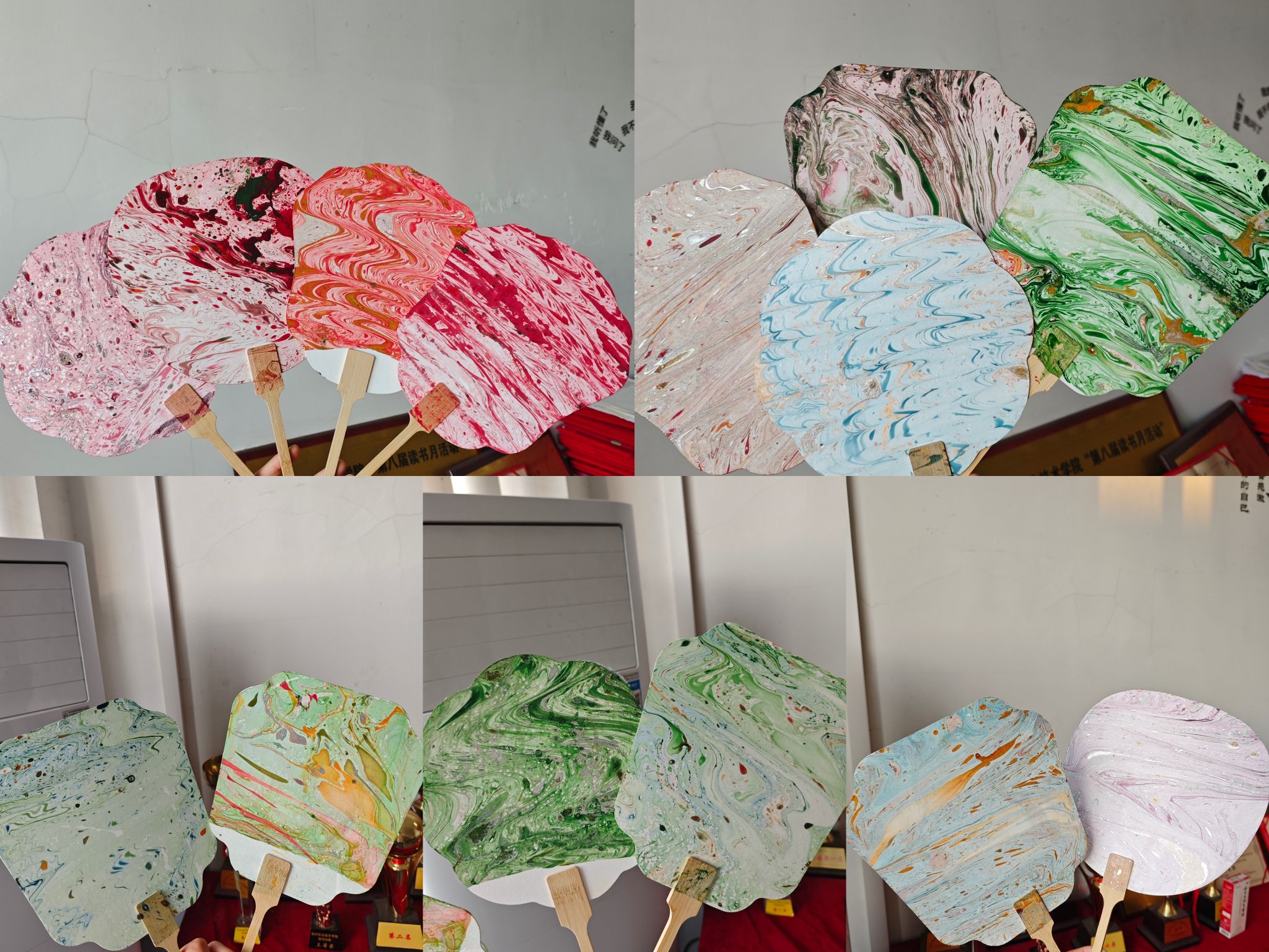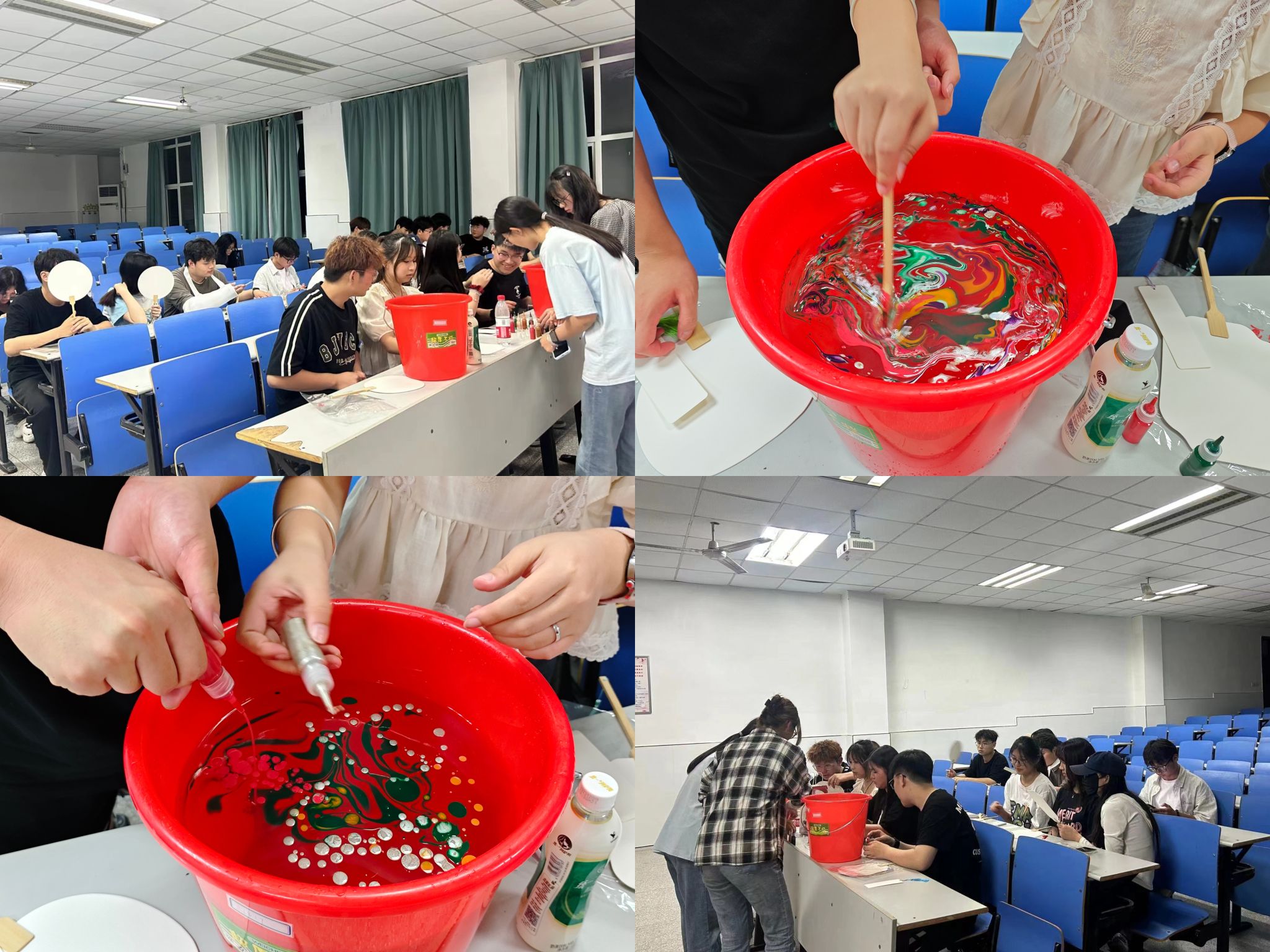 活动伊始,同学们在活动负责人的带领下,首先了解了漆扇的历史渊源和文化意义。在实践环节中,同学们使用漆艺中的“漂漆”技法,利用了漆不溶于水的特质,选取自己喜欢的色漆,把色漆滴在水面上,再用搅拌棒勾勒出图案效果,团扇慢慢放入水中,漆色随着水流附着在团扇上,一把把独一无二的漆扇就此诞生。现场氛围活跃,同学们互相交流心得,共同分享创作的喜悦。