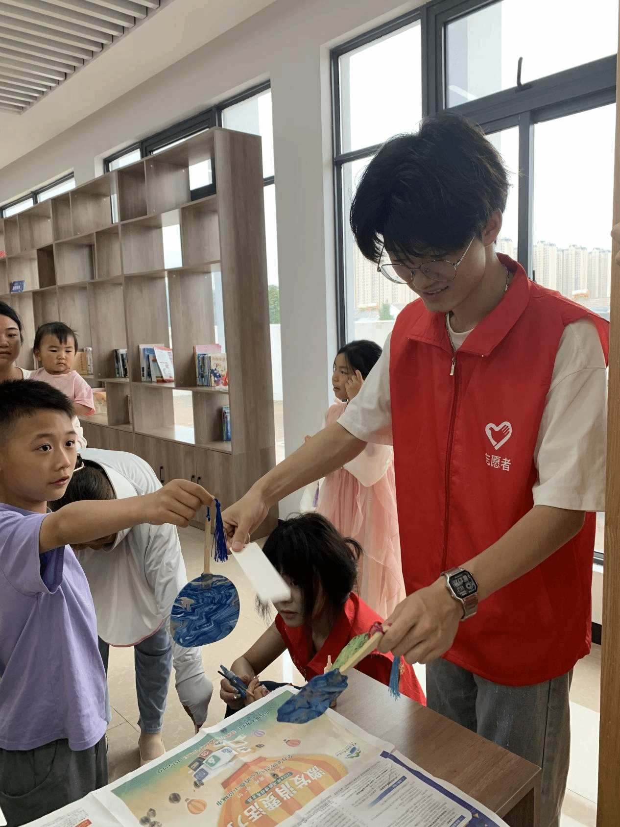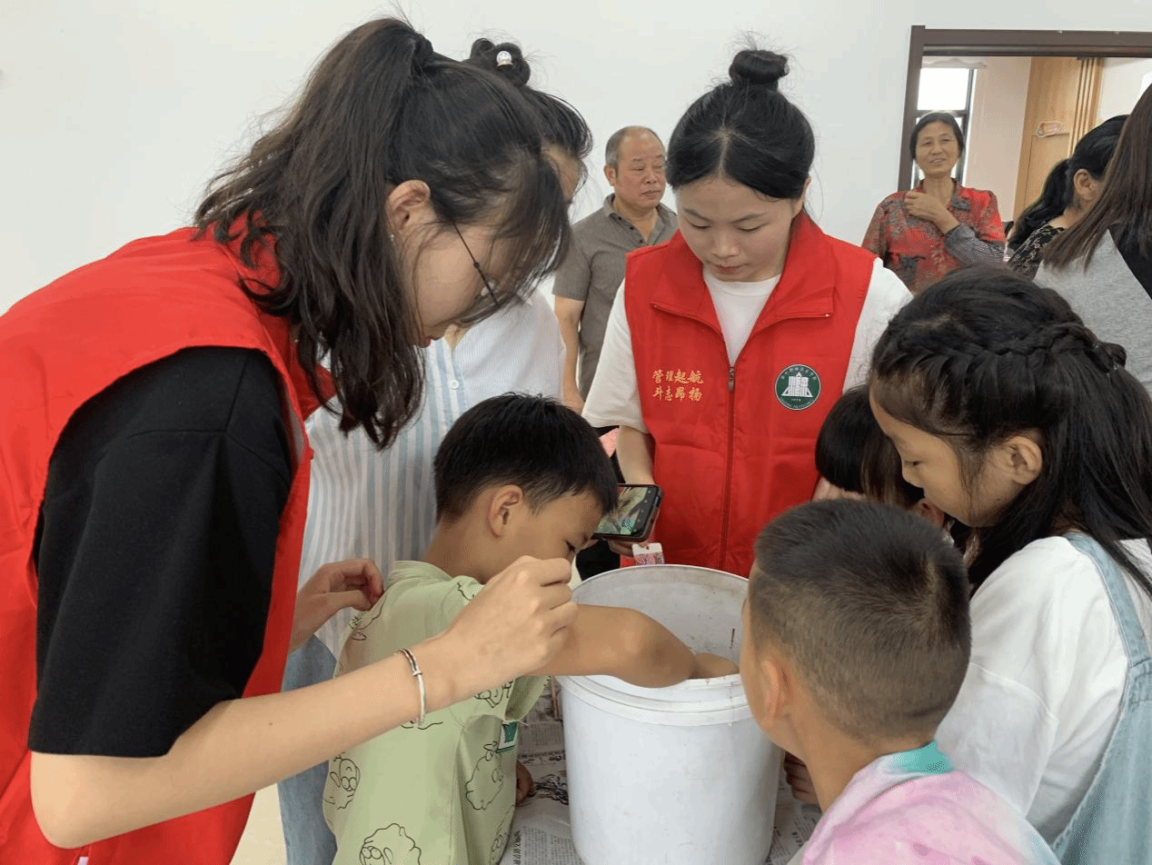 在黄牌村,孩子们那一双双充满好奇与期待的眼睛,成为了学生们最大的动力。实践活动的第一站,是充满艺术魅力的非遗漆扇和非遗扎染教学体验。管理学院的学生们精心准备了丰富的材料和工具,用生动形象的语言为孩子们讲解传统工艺的历史渊源、制作技巧和文化内涵。孩子们围坐在一起,聚精会神地聆听,随后迫不及待地动手尝试。在学生们的耐心指导下,孩子们充分发挥自己的想象力和创造力,精心绘制和缝制出属于自己的漆扇和扎染作品。当一幅幅色彩斑斓、图案精美的作品呈现在眼前时,孩子们的脸上洋溢着自豪和喜悦的笑容,他们不仅感受到了传统工艺的独特魅力,更在心中种下了传承和弘扬中华优秀传统文化的种子。