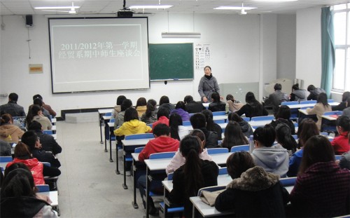 11月9日下午,经贸系在1101教室如期举行了期中师生座谈会。系领导翁嘉晨主任、宋君远副主任和各教研室教师代表与各班级学生代表济济一堂,共同恳谈本学期开学以来的教学情况。