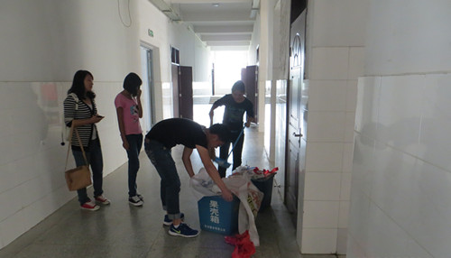 2013年9月28日下午,经贸系团总支、学生会组织了一部分志愿者们打扫经贸系各楼层卫生,为加快工作效率同学们分工协作,一些人擦洗系部宣传栏、一些人打扫班级卫生、一些人负责桌椅的整理,系部很快就干净舒适起来。