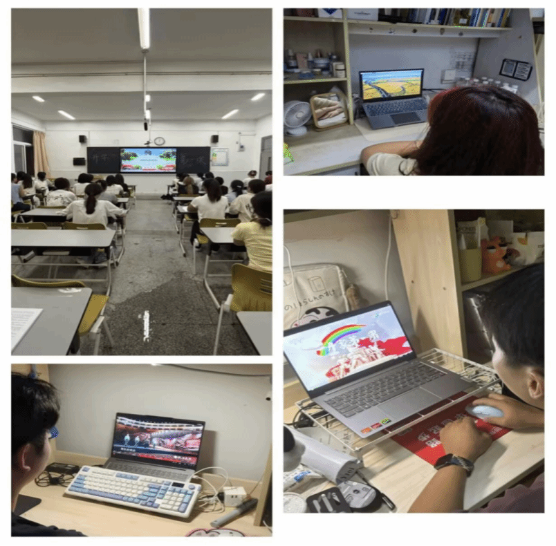 各班级提前完成设备调试,确保直播顺利进行。观看过程中,“铭记与奋斗”的主题通过鲜活案例与动人讲述层层传递,同学们全神贯注,时而静心聆听榜样事迹,时而沉思感悟奋斗精神,现场氛围庄重热烈,主题内涵引发强烈共鸣。
