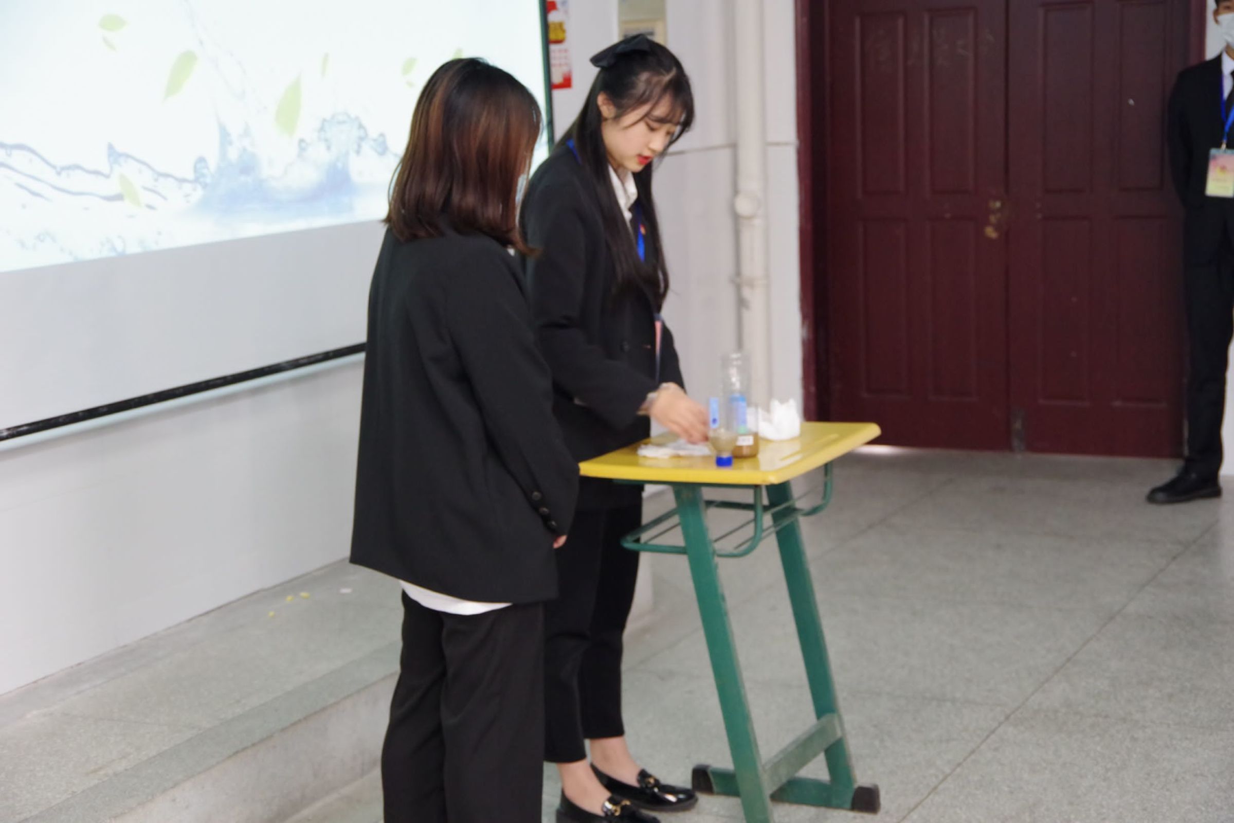 活动开始前,由工作人员安排班级代表有序进场并点名。活动开始主持人播放幻灯片和视频,指出了生活中浪费水的现象及行为,宣传节约用水的方法。然后工作人员演示脏水过滤的小实验。最后,主持人呼吁我们要做节约用水的实践者。