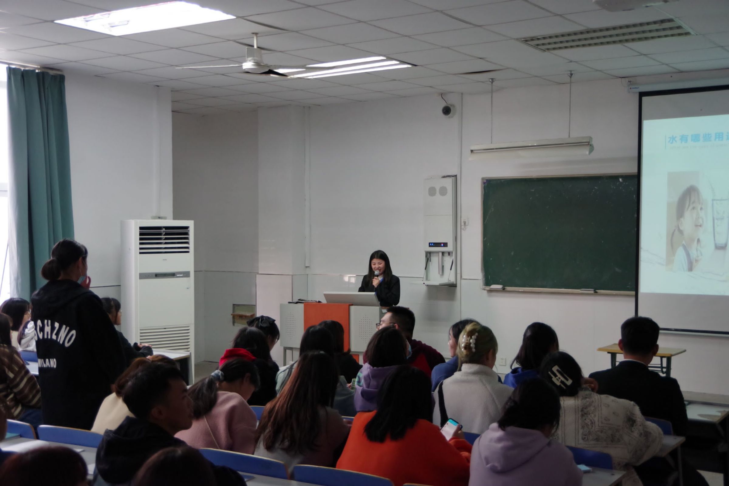 活动开始前,由工作人员安排班级代表有序进场并点名。活动开始主持人播放幻灯片和视频,指出了生活中浪费水的现象及行为,宣传节约用水的方法。然后工作人员演示脏水过滤的小实验。最后,主持人呼吁我们要做节约用水的实践者。