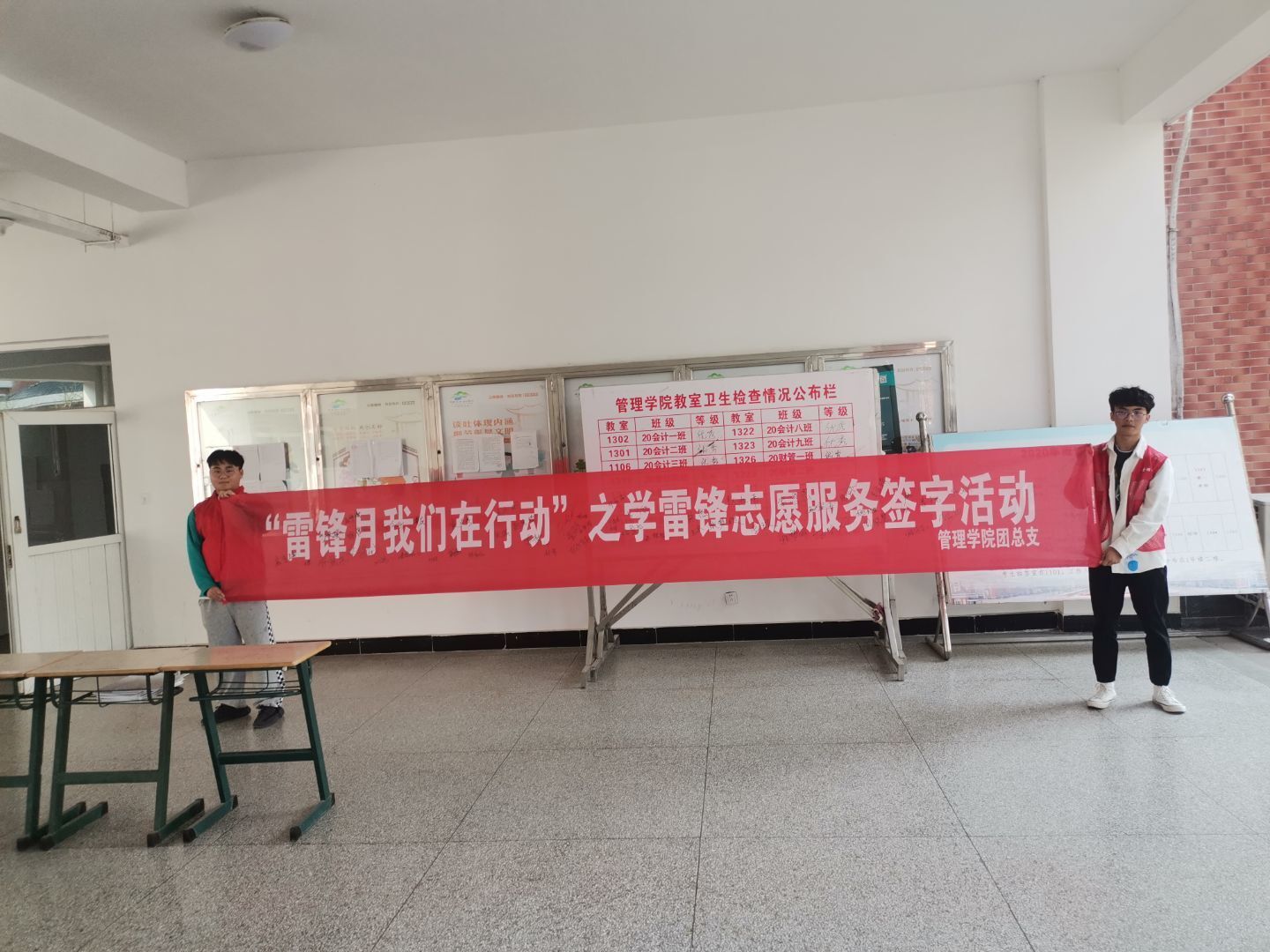 为弘扬雷锋精神,加强在校青年的思想道德建设,管理学院团总支于3月26日下午在致真楼一楼大厅开展“雷锋月我们在行动”之学雷锋志愿服务签字活动。本次活动由团总支副书记胡春晓负责,管理学院全体同学参加。