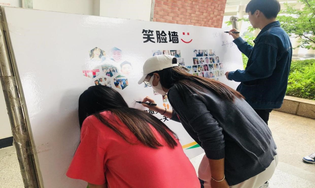 在学校5·25心理活动月到来之际,我们借助“世界微笑日”,在学院里广泛征集笑脸照片,经过班级和学院筛选,最终将具有感染力的笑脸照片做成笑脸墙,并邀请学生代表在笑脸墙上签下自己的名字。此外,在活动现场,同学们互相给对方佩戴笑脸图章,以此来传播微笑的力量,引导身边人形成“没事多笑笑,有事更要笑”的乐观心态。