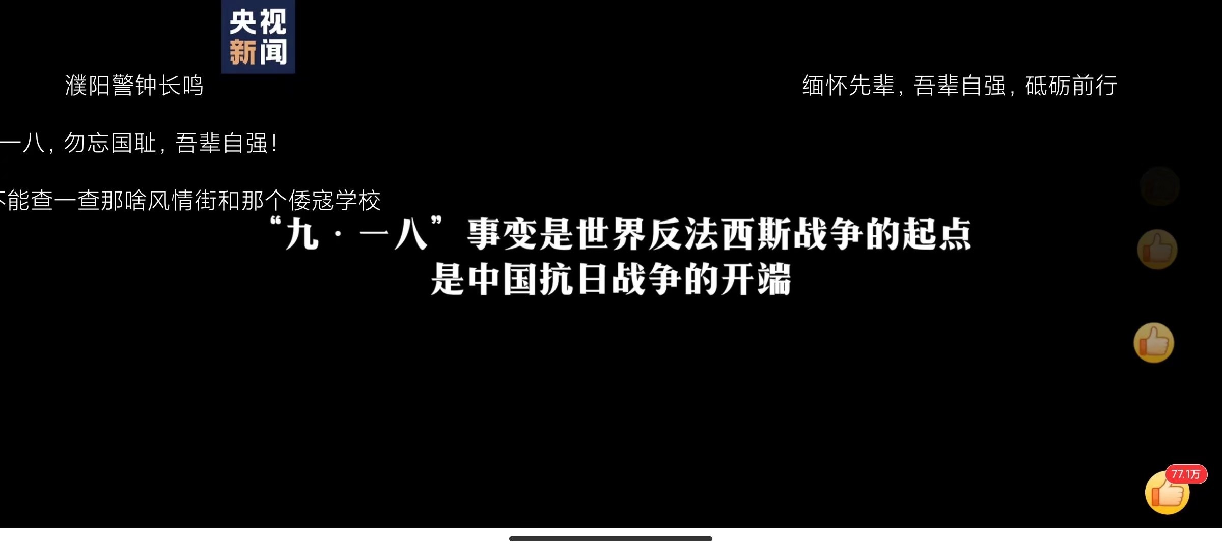 之前,学院组织我们观看了央视新闻“勿忘九一八撞钟鸣警仪式”的直播,让我们知道“九一八”这个用鲜血凝成的数字镌刻着中华民族的切肤之痛,1931年到1945年超过3500万同胞伤亡,4200万难民无家可归。14年抗日战争中这片土地涌现出无数可歌可泣的英雄事迹,中国人民用鲜血和牺牲赶走了侵略者,取得了伟大胜利,中国人民以不屈不挠的精神告诉世界中华民族不可欺、不可辱,中华民族不可战胜!