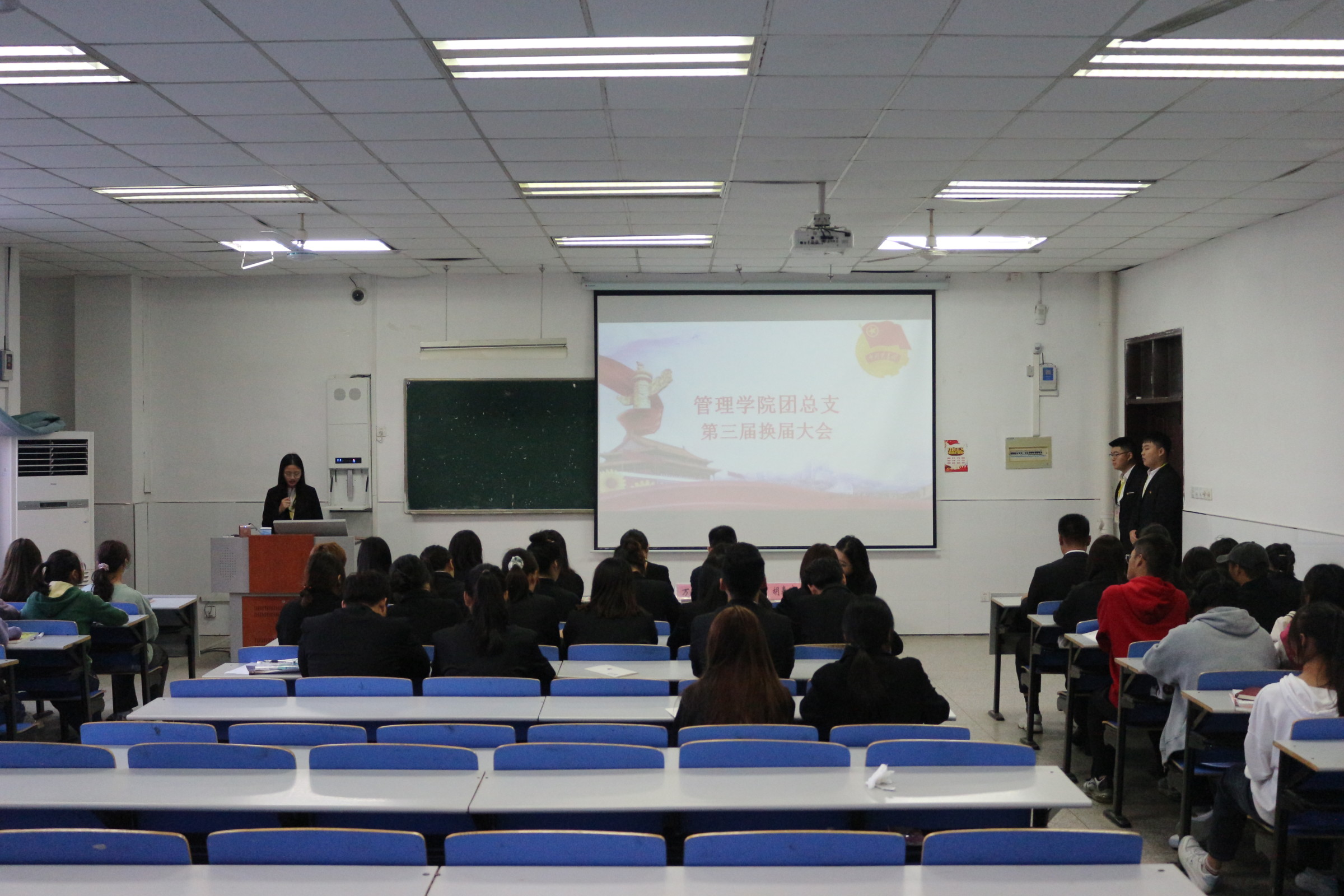 换届大会在国歌声中开启。新一届副书记和各部门部长依次发表就职演说,纷纷表述了对本部门以后工作的打算、对自己的要求和建设、发展好本部门的信心。随后,管理学院第二届团总支副书记胡春晓发表述职报告,包含了对过去团总支工作的回顾,以及对下一届团总支干事的期望。