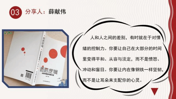 阅读分享会活动的开展,让参加活动的所有党员教师接受了一次思想的洗礼和精神层面的熏陶。大家纷纷表示,这次主题党日活动,不仅体会到“书香伴我行”的内涵,通过交流更加认识到,读书是一种直达灵魂的享受,使人回归了阅读和学习的本质,希望今后能够开阔视野,调整心态,以更加昂扬的斗志投入新一年的教育教学工作中。