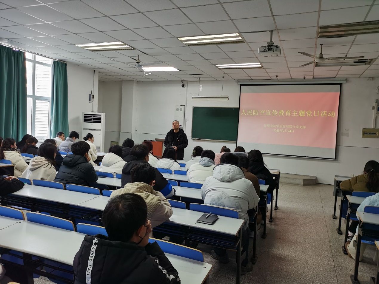 为进一步加强管理学院学生人民防空宣传教育工作,按照《关于进一步加强人民防空宣传教育的意见》(皖国动办[2023]2号)和校领导指示精神,管理学院学生管理联合党支部于2023年2月24日上午在1102教室开展人民防空宣传教育主题党日活动,本次活动由管理学院学生管理联合党支部书记李腾飞主持,部分党员、入党积极分子参加了活动。