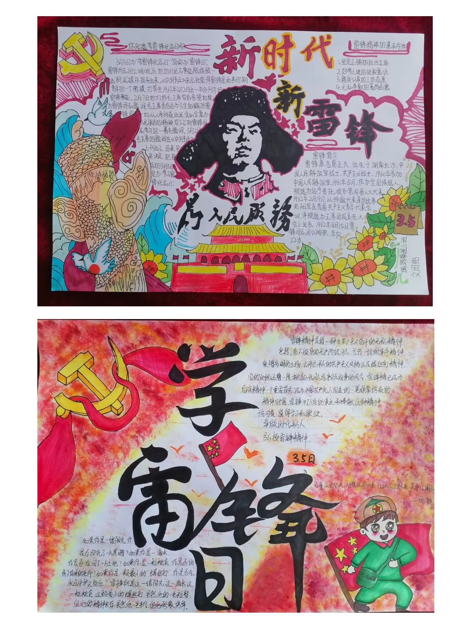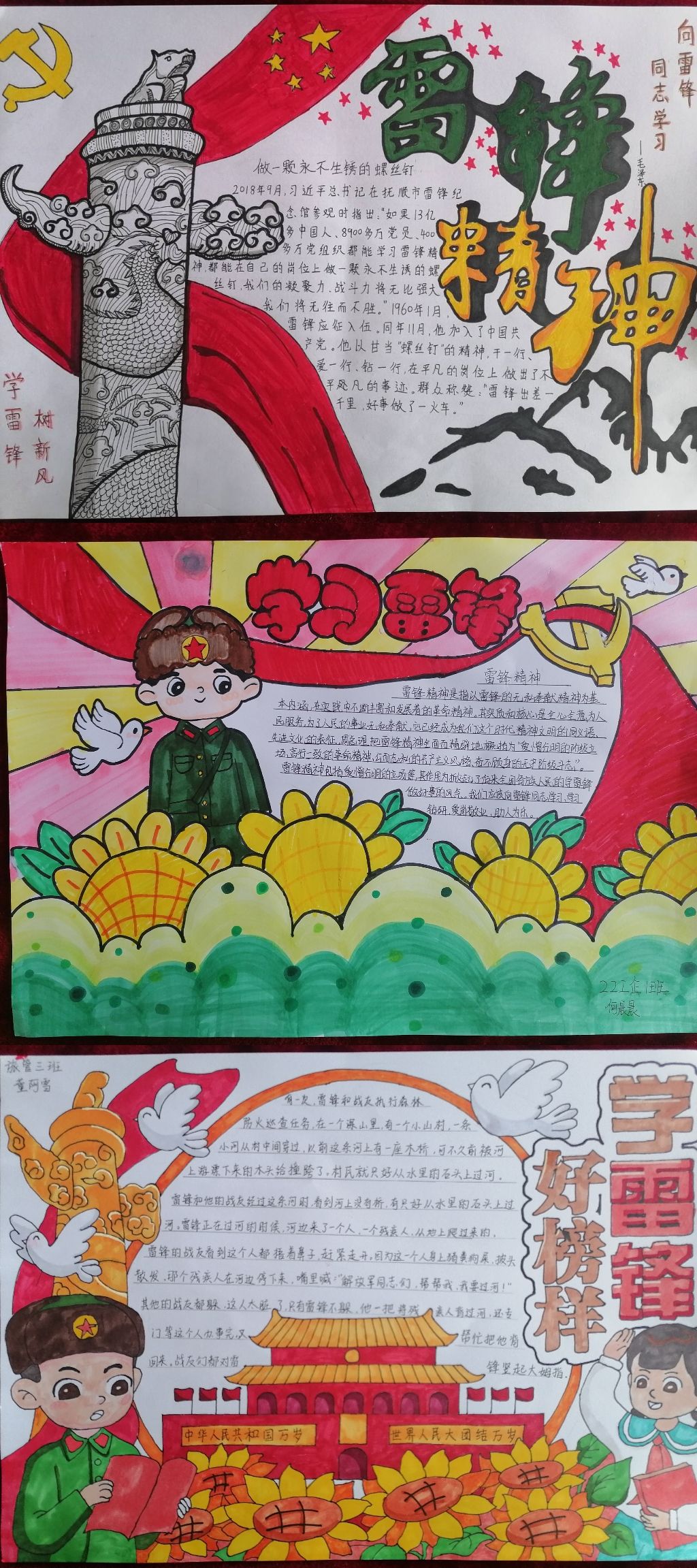 各班积极组织参赛,学生以图文并茂的形式,说雷锋故事、讲雷锋事迹、树雷锋精神。从各个方面再现雷锋故事和自己身边的助人为乐的好人好事。共选出6幅制作精美、内容丰富、形式饱满的作品参加展览。