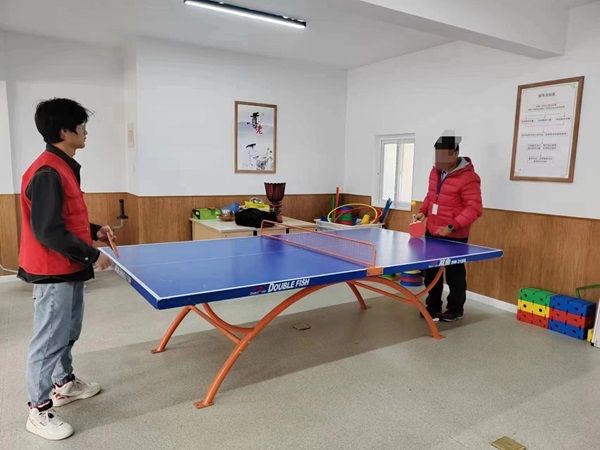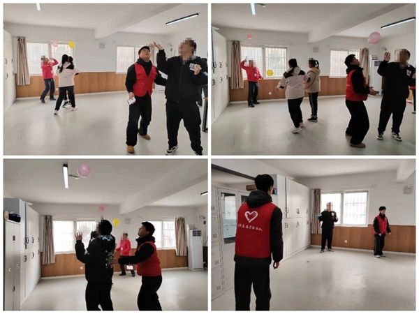 我院青年志愿者身着红色马甲,带着温暖与关爱踏入了这片特殊儿童的世界。这次义务支教的内容主要是多种运动锻炼小游戏的练习,首先,是乒乓球的对打练习。志愿者通过简单初级的发球方式,与星星孩子进行了乒乓球互动练习,充分锻炼了星星孩子的注意力和执行力。随后,我院志愿者设计了两种互动游戏,分别是“顶气球”“跟着指令做动作”。星星的孩子们在游戏中充分发挥主观能动性,与志愿者们积极互动交流,整个过程充满了欢声笑语,乐此不疲。