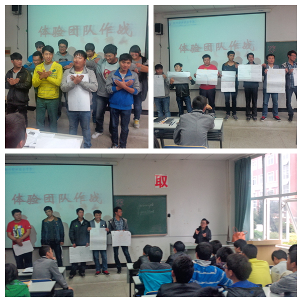 为了增强班级同学的团队意识,增强班级组织的凝聚力和向心力,机电系于2013年11月18号下午,由辅导员谢丽丽老师带领部分新生班级在5103教室进行了一场“体验团队作战”的主题班会活动。