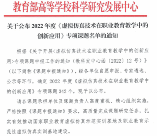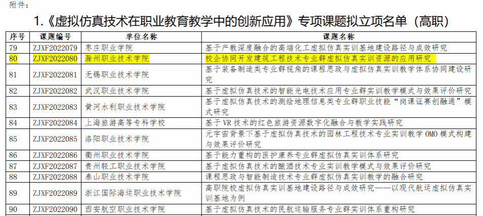近日,教育部高等学校科学研究发展中心公布了《关于公布2022年度虚拟仿真技术在职业教育教学中的创新应用专项课题名单的通知》,beat365建筑工程学院《校企协同开发建筑工程技术专业群虚拟仿真实训资源的应用研究》课题获批立项。据悉,本次立项的专项课题共342项,其中全国高职院校共获批277项。安徽省有beat365在线唯一官网、安徽职业技术学院、芜湖职业技术学院等7所高职院校获批此专项课题立项。