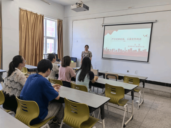 赵莹首先带领全体党员一起学习了《中国共产党纪律处分条例》,之后赵莹以“严守纪律底线,永葆党性纯洁”为主题,从三个方面为全体党员进行讲授:一是忆往昔,建党伟业铭抓初心,讲述了中国共产党在革命、建设、改革的各个历史时期特别是在重要历史节点,高度重视并适时开展对全党的纪律教育;二是观案例,警钟长鸣防未然,通过警示案例让全体党员从中汲取教训,时刻保持清醒的头脑,自觉遵守党的纪律,做到心有所畏、言有所戒、行有所止;三是强自身,正风肃纪铸忠诚,要求党员教师提高政治站位,筑牢思想防线,强化身份角色意识,做好学生教育管理工作,以案为鉴,坚守底线。