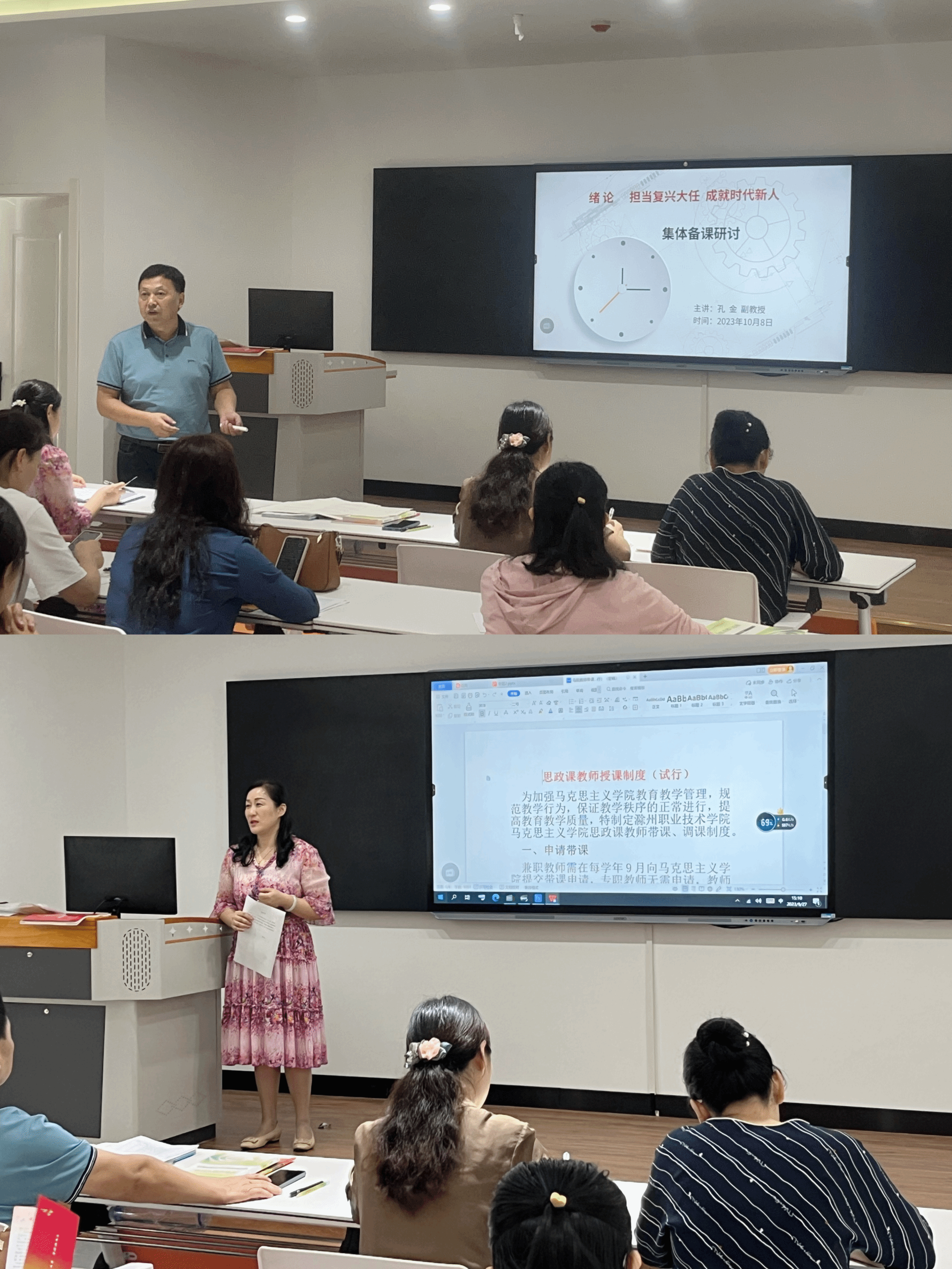 首先,张家莉对新制定的《思政课教师授课制度(试行)》进行了详细解读,并就制度的执行对教师提出了具体要求,要求大家把这一制度坚持好、落实好。之后,两位思政课教师就《思想道德与法治》2023版教材中的绪论和第一章节围绕课程性质和教学安排进行了系统梳理,认为,在教学过程中要以理论及现实热点为切入口,点线结合,注意理论讲授和价值引领相结合,在教学方法上通过理论讲授法、互动讨论法、案例研讨法等方法,讲清楚“何谓新时代”以及“何谓时代新人”等问题,引导学生立大志、明大德、成大才、担大任,不断提升思想道德素质和法治素养,要着力《思想道德与法治》的“绪论”是学生进入大学后学习的第一节思政课,教师们一定要在开学第一课上讲清本课程对于同学们的人生的重要意义。围绕《思想道德与法治》2023版,全体授课教师聚焦党的二十大精神就学情分析,课程定位、教学内容、教学方法、课程考核等方面进行了深入探讨,深化了对教材的把握和教学内容的理解。参会教师纷纷表示,通过集体备课、研课、磨课,在教学中要讲深讲透思想道德与法治的内涵实质,奠定学生学会运用马克思主义的立场、观点和方法分析问题、解决问题。新学期将继续反复打磨教学内容,针对教学新目标新挑战,以更饱满的热情、更积极的态度、更多样的方法开展好思政课教育教学工作,努力做好学生思想的领路人。马克思主义学院将继续坚持开展思政课教师集体备课会制度,最大限度发挥集体备课的作用,通过集体备课进一步提升教师教研水平,切实发挥好思政课立德树人、培根铸魂作用,努力打造高精尖水平的思政金课。最后马克思主义学院思政教育教研室主任胡颖颖就上课时间、教学进度、实践教学、听课制度、教学纪律、考核方式等问题作了部署。