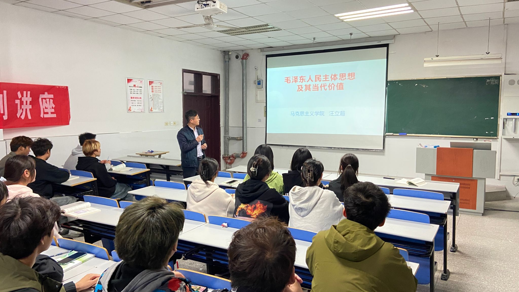 今年是毛泽东诞辰130周年,为了缅怀伟大领袖,深化党史学习教育,11月8日,马克思主义学院思政理论课教师汪立超副教授在1101教室为2023级学生做了一场“毛泽东人民主体思想及其当代价值”学术讲座。这是马克思主义学院常态化长效化开展党史学习教育的具体举措,同时也是进一步推动“思政励志教育课”的深入开展的具体行动。