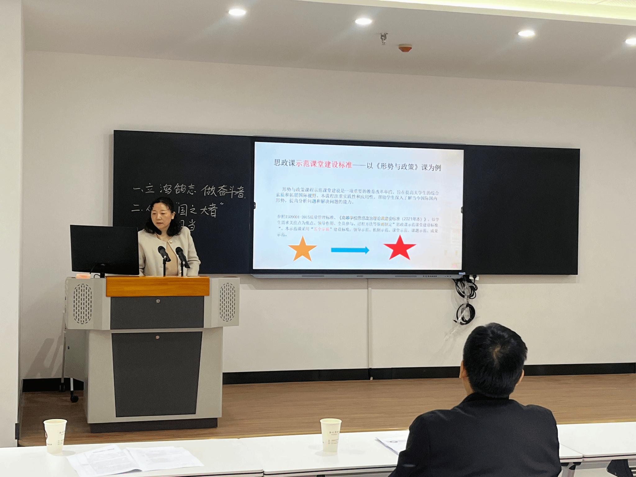 “形势与政策”教研室主任付金凤参考《高等学校思想政治理论课建设标准(2021年本)》、ISO9001-2015质量管理标准、教研室工作标准等文件,结合工作实际,从领导示范、机制示范、课堂示范、课题示范、成果示范五个方面进行标准规范汇报,并对取得的对应的阶段性成果做了简要介绍,以及下一步工作的重点和方向。