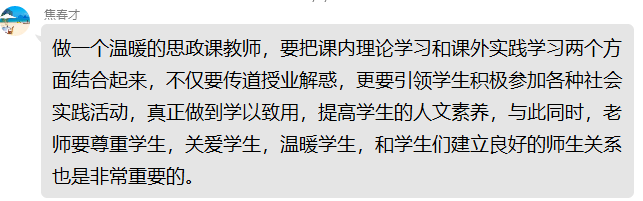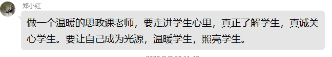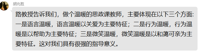 路丙辉做了“做一个温暖的思政课教师”专题讲座。讲座围绕“为什么要做一个温暖的思政课教师、温暖的教师是什么样、如何成为温暖的思政课教师?”讲座中,路丙辉首先解释了“温暖”一词在教师职业中的具体内涵,“温暖”是对合格教师的进一步要求;对于“温暖的教师”是什么样的,路丙辉表达了自己的认识:思想、心理健康,主动关注学生,理解尊重学生,公平公正等。在“我的认识与体会”和“我的践行和体悟”中,谈自己如何做到“欣赏和鼓励学生,不嫌弃学生;尽力而为帮助学生;严格要求自己;做好课外功夫”以及让教育回归生活,让教育贴近实际,让教师关照学生及对学生有效引领