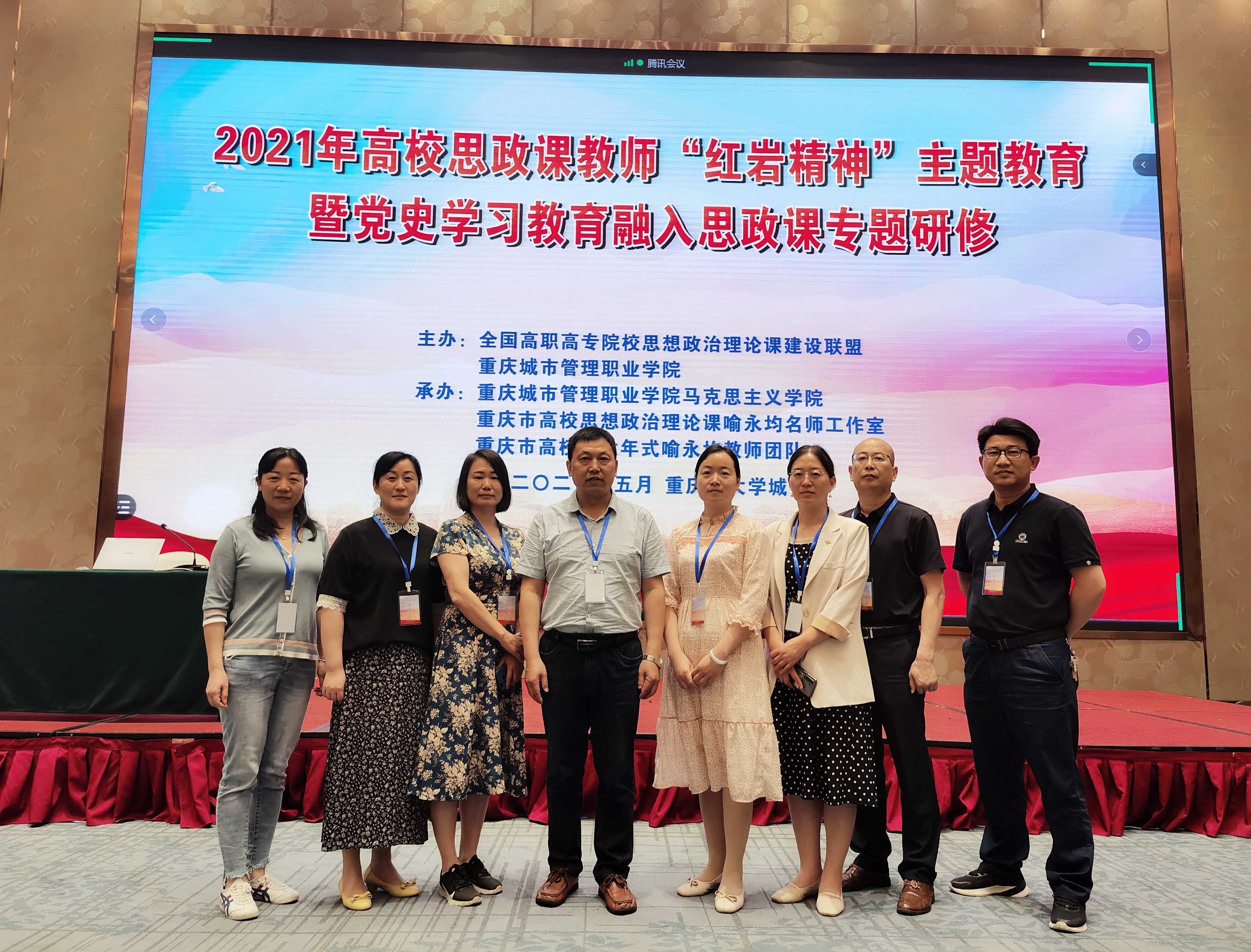 为深入学习贯彻习近平新时代中国特色社会主义思想,持续推进习近平新时代中国特色社会主义思想进教材进课堂进头脑,全面落实习近平总书记在党史学习教育动员大会上的重要讲话精神,把党史学习教育融入高校思想政治理论课育人全过程,真正做到学史明理、学史增信、学史崇德、学史力行,5月28-31日,由全国高职高专院校思想政治理论课建设联盟主办、重庆城市管理职业学院承办了2021年高校思政课教师“红岩精神”主题教育暨党史学习教育融入思政课专题研修。有来自全国72所高职院校,210余名思政教师参加本次研修班学习。马克思主义学院派出孔金、付金凤、张家莉、王素珍、郑小红、陶德庆、陈琴、焦春才八位老师参加了该研修班。本次研修安排有专题报告、经验交流、教学展示、经验分享和实践教育等活动。