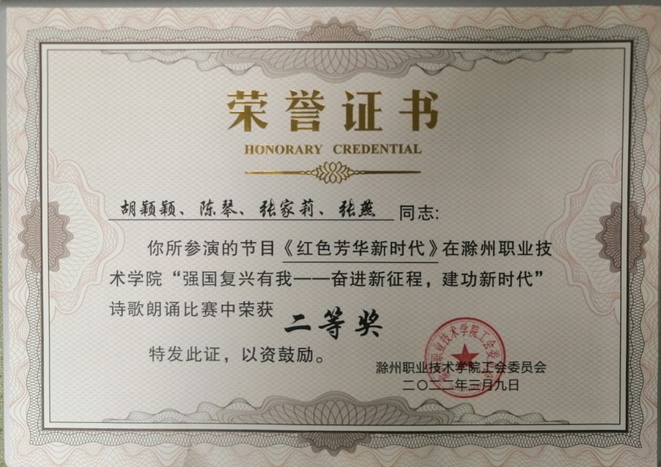 在“强国复兴有我——奋进新征程建功新时代”庆祝第112个“三八”国际妇女节诗歌朗诵比赛中,张家丽、胡颖颖、陈琴、张燕老师带来的朗诵作品《红色芳华新时代》获得二等奖。