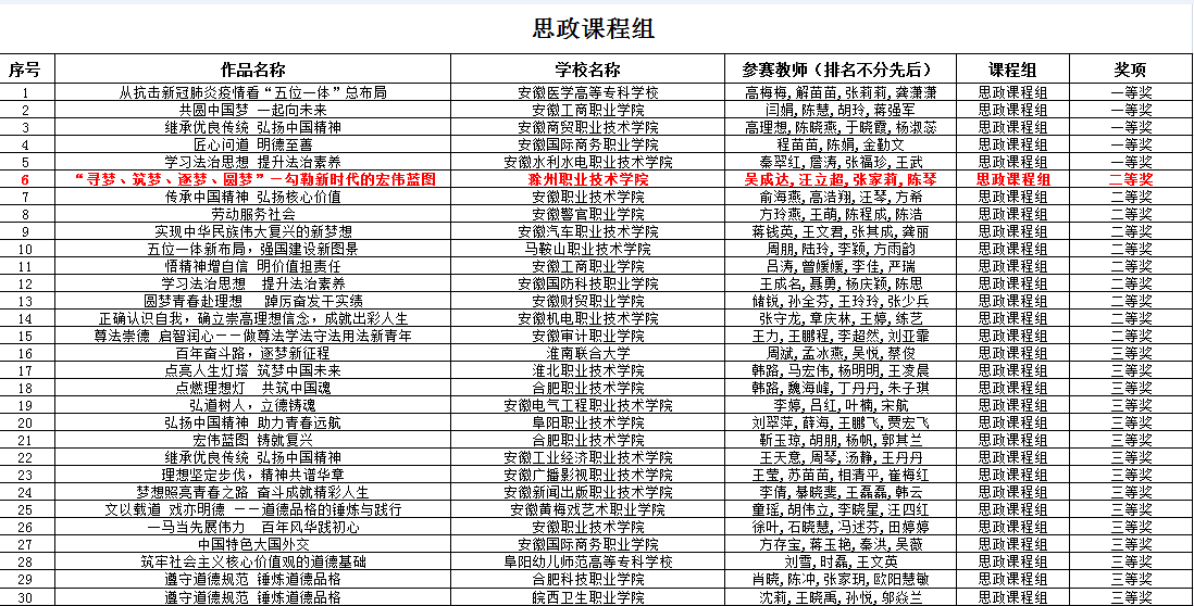 本次省赛共收到63所高职院校报送的499件参赛作品。经专家网络初评和线上决赛,大赛共评选出305个获奖作品,其中一等奖52个,二等奖101个,三等奖152个。其中安徽省高职院校思政课程组报送70件参赛作品,经思政专家组初评和线上决赛,选出一等奖5个,二等奖10个,我院由吴成达、汪立超、张家莉、陈琴四位中青年骨干教师组队的参赛作品《“寻梦、筑梦、逐梦、圆梦”——勾勒新时代的宏伟蓝图》获得省赛二等奖的好成绩,较2020年取得的省赛三等奖有新突破。