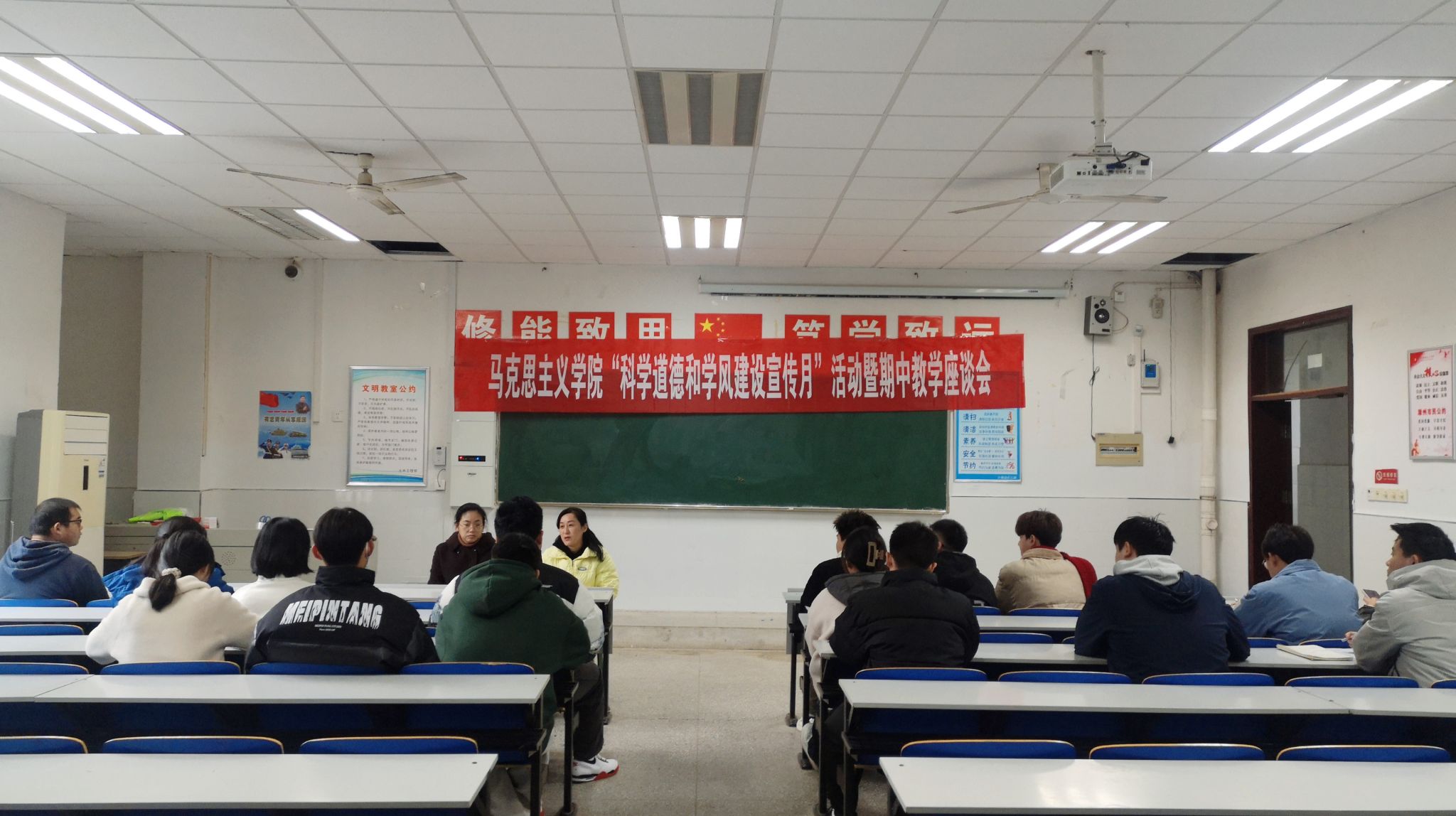 为全面贯彻落实习近平总书记关于学风建设和科研诚信建设工作以及研究生教育工作重要指示精神,引导青年学生系好学术生涯“第一粒扣子”,11月30日上午,马克思主义学院在4119教室开展“科学道德和学风建设宣传月”活动暨期中教学座谈会,会议由“德法”课教研室主任胡颖颖、“概论”课教研室主任张家莉主持,来自建筑工程学院、信息工程学院、互联网学院、机械与汽车工程学院、交通学院等学院共17名学生代表参加。