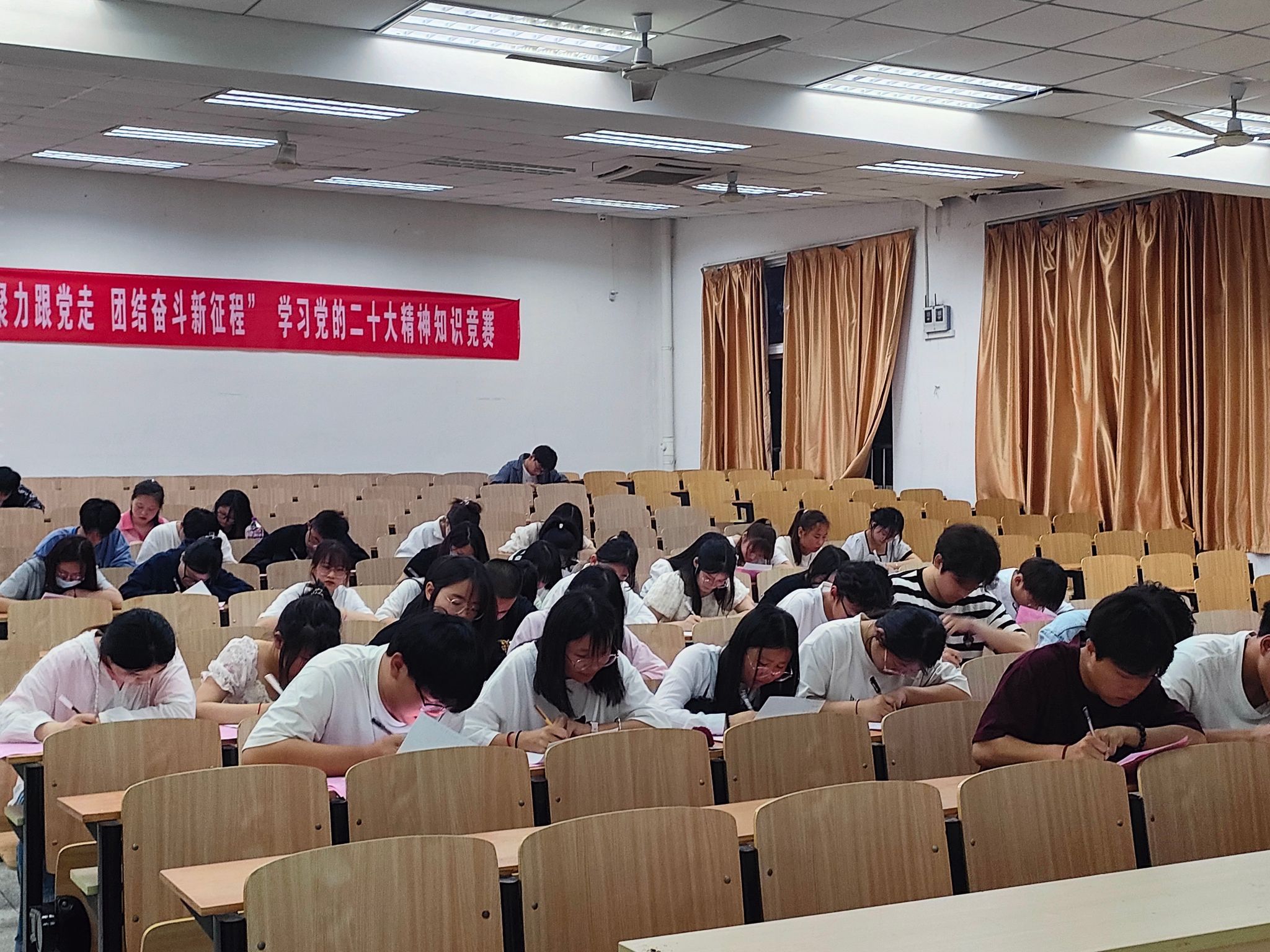 学院团总支带领全体参赛同学,再次认真学习党的二十大报告主要内容,组织现场测试活动。同学们一边思考、一边认真答题,加深对党的二十大精神深刻内涵的理解把握。各班级也相继以主题团日、班会等形式开展了答题活动。