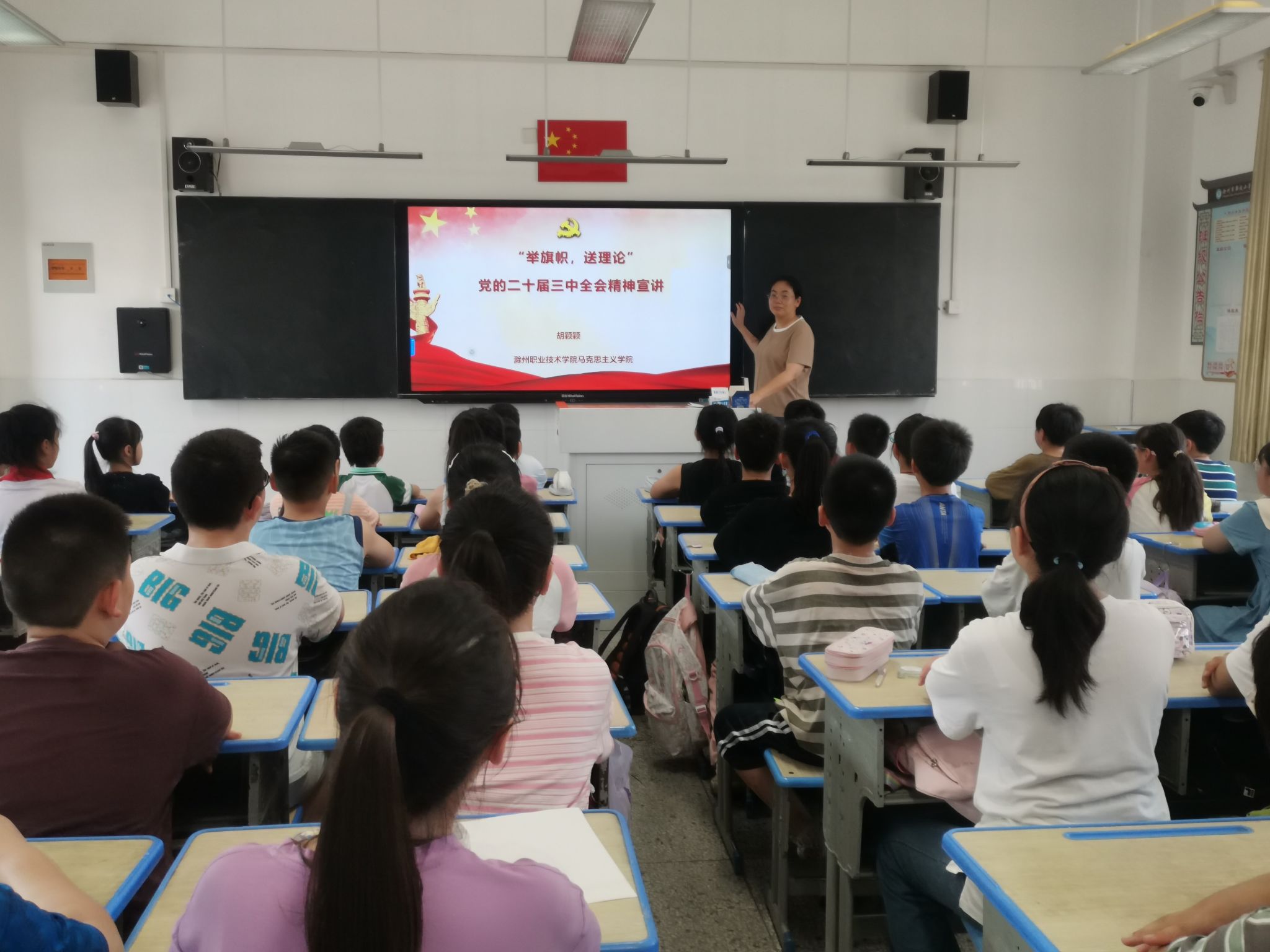 为深入学习宣传贯彻党的二十届三中全会精神,beat365在线唯一官网马克思主义学院全体教师组建学校教师宣讲团,走进乡镇、社区、企业、中小学,宣讲党的创新理论,9月4日,胡颖颖老师来到解放小学五年级2班开展了“举旗帜,送理论”党的二十届三中全会精神宣讲活动。