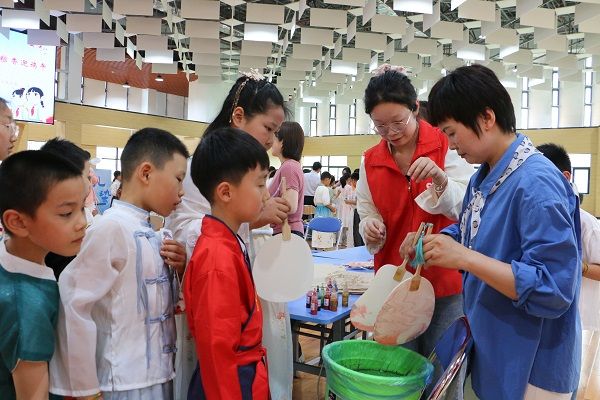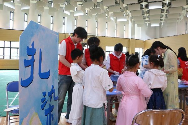 管理学院团总支选送的古典舞《折纸花满衣》和《青花瓷》与紫薇小学少先队员们编排的特色节目为孩子们送上了一份集欢乐、传统文化与多元共建于一体的节日厚礼。展演活动结束后,管理学院青年志愿者们与少先队员们“大手牵小手”共同体验端午主题非遗活动。孩子们在志愿者的耐心指导下感受了古代礼仪游戏投壶的雅趣,亲手缝制香囊、捆扎艾草门挂的乐趣,并完成了扎染方巾和漆扇制作,让非遗技艺在稚嫩的手中焕发新生。