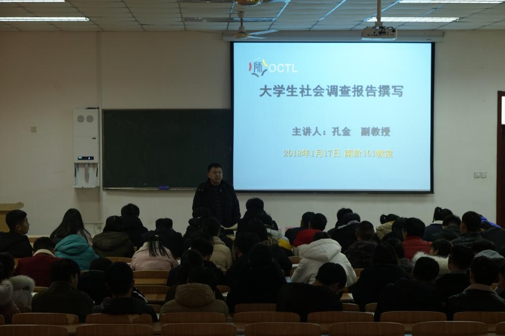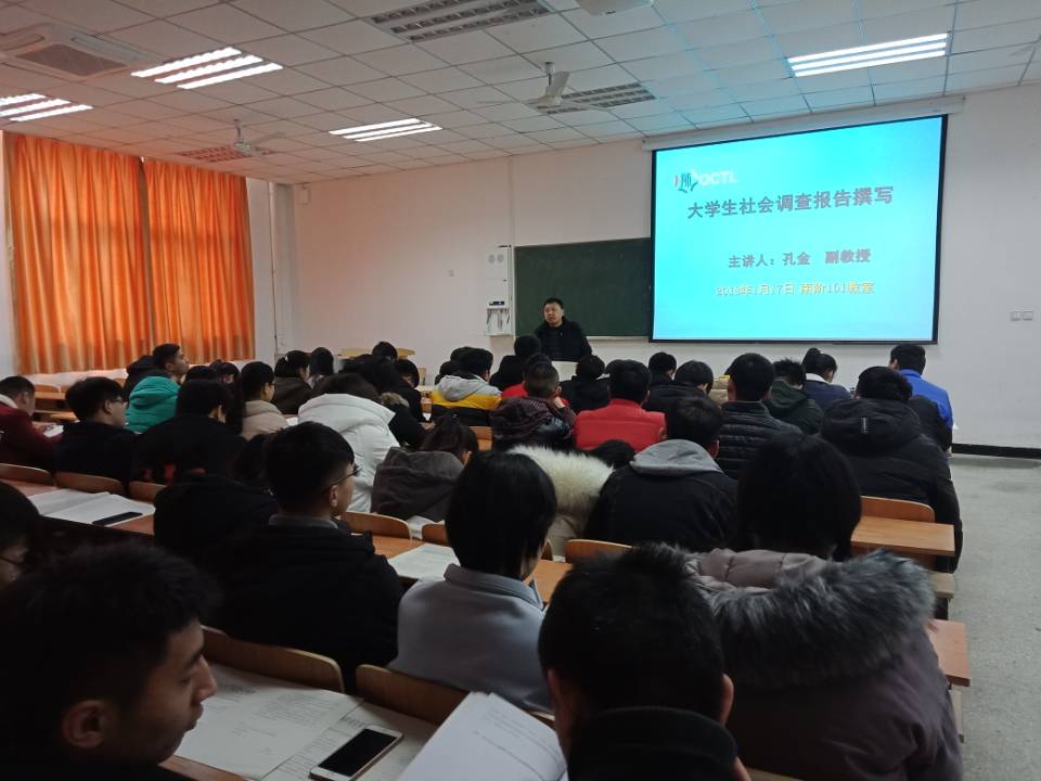 为落实思政理论课实践教学,1月17日,思政部在南阶101教室举办“大学生社会调查报告撰写”讲座,主讲人为思政部孔金副教授。