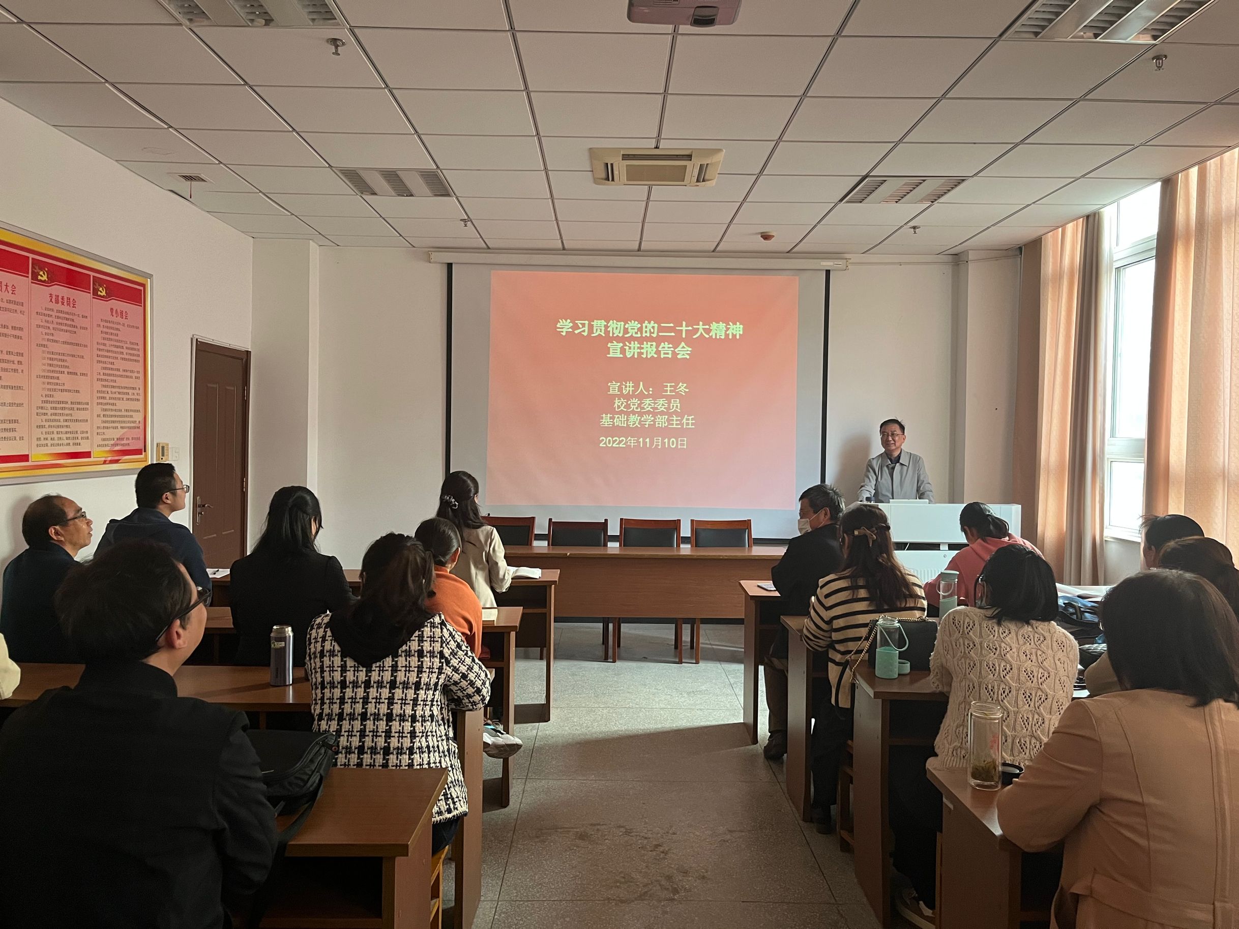 按照学校党委统一部署,11月10日下午,校党委委员、基础教学部主任王冬在综合楼318会议室为基础教学部全体教职工宣讲党的二十大精神。会议由党总支书记林文静主持,全体教职工认真聆听了宣讲。