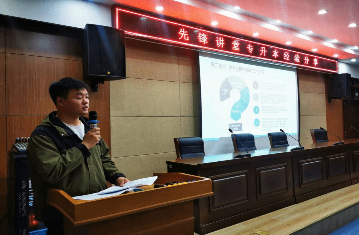最后,黄正权同学上台分享了他专升本备考的心得体会。他慷慨地分享了自己在备考期间的学习方法、时间管理策略以及心态调整的秘诀。从如何制定有效的学习计划,到如何应对备考中的压力和挑战,他的每一点经验都像明灯一样,为在场同学们指明了前进的方向。