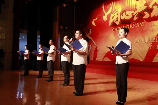 从报名参加以来,基础部教工党支部积极筹划,为了避开老师们不同的上课时间,加紧排练。在党总支书记的鼓励支持下,参演老师们经常牺牲休息时间,下班后聚在一起认真练习合诵。从最初的选稿、选曲,到表演时的走台、站位、表情等每一个细节,六位老师无不认真对待、细心推敲。经过一次次认真合练,老师们的不懈努力终有所获。朗诵节目的整个内容和步骤圆满确定,老师们的整体朗诵水平也有了很大的提高。5日下午在一阵欢乐祥和的乐曲声中,基础部老师们以一首《我们的中国梦》率先登台表演,拉开了诗歌朗诵会的序幕。老师们精彩表现得到了台下观众们一次又一次热烈的掌声。