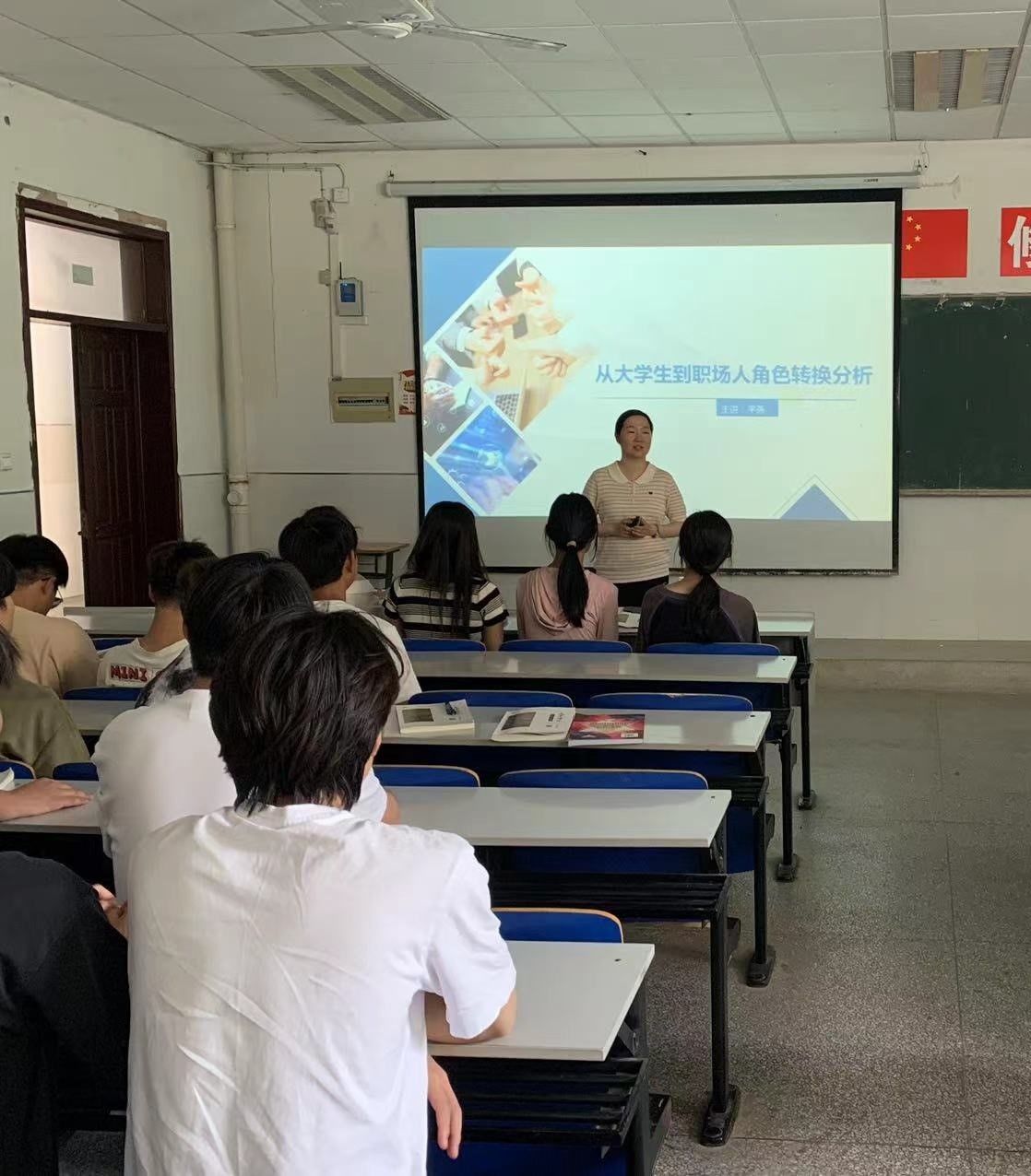 平燕老师从职业规划理论和自身工作经验,讲解了大学生步入职场要做好角色定位的变化,从学生到员工,从被动接受到主动贡献等内容,阐述了在职场中心态调整的重要性、技能转换的必要性,同时也指出进入职场还需要了解必备的职场文化与规则,为适应职场新角色做足准备。平老师就学生现场提出的问题,建议学生提前做好职业规划,了解行业动态;通过实习积累经验,了解职场环境;坚持终身学习,不断更新知识和技能。