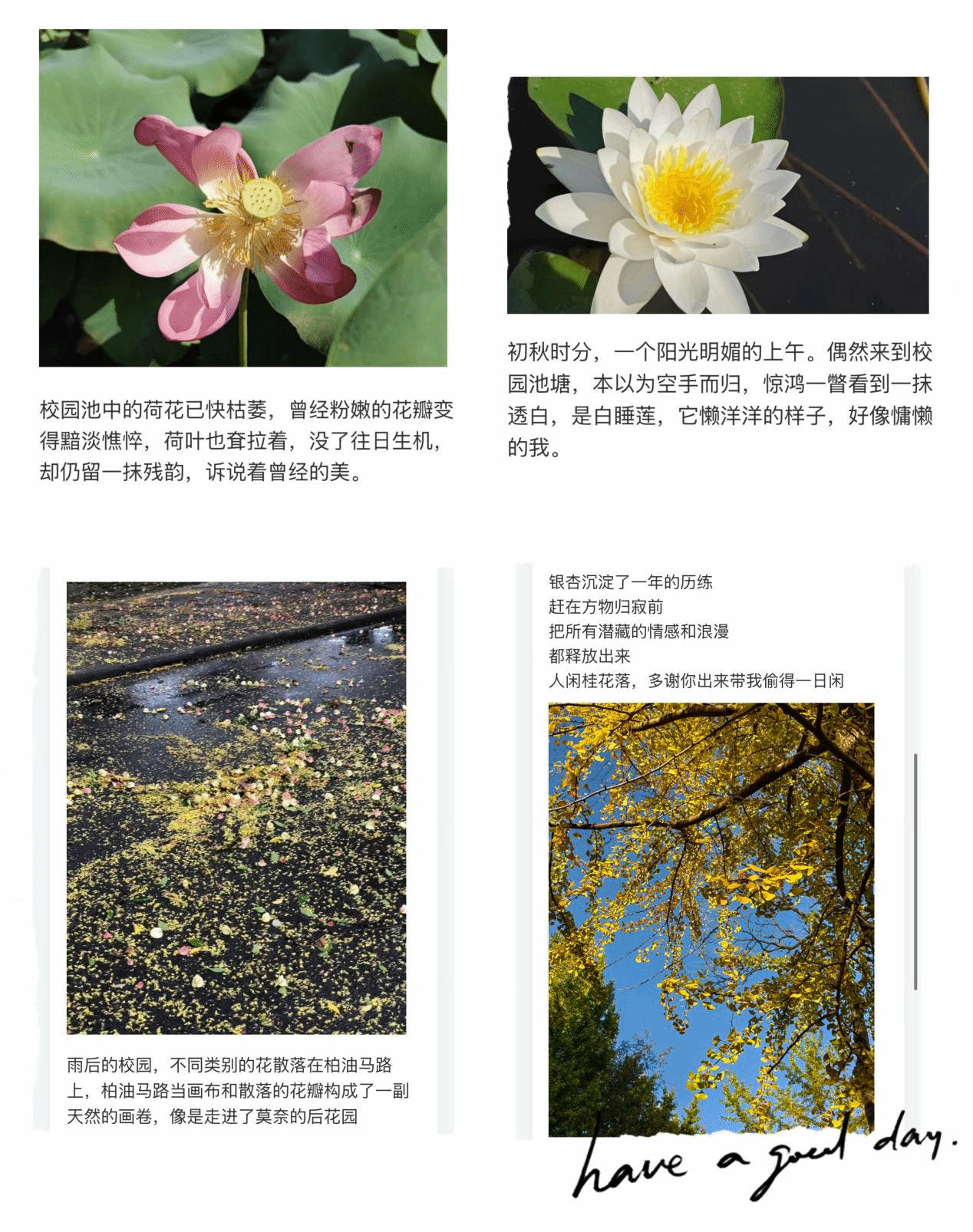 陈鹤琴先生所言“大自然、大社会都是活教材”。在实践课上,同学们穿梭于校园中,从校园的历史文化印记到波光粼粼的湖泊、风景如画的花园角落,每一处都隐藏着意想不到的惊喜。有的同学关注了很多日常中被忽略的事物,收集了树叶、鲜花等制作成创意作品;有的同学用相机记录下鲜花盛开时的灿烂笑容,留下了珍贵的记忆;有的同学看到了劳动者在校园内辛勤工作的瞬间……这些美好如同一股股暖流,温暖着他们的心灵,激发着他们内心的正能量。