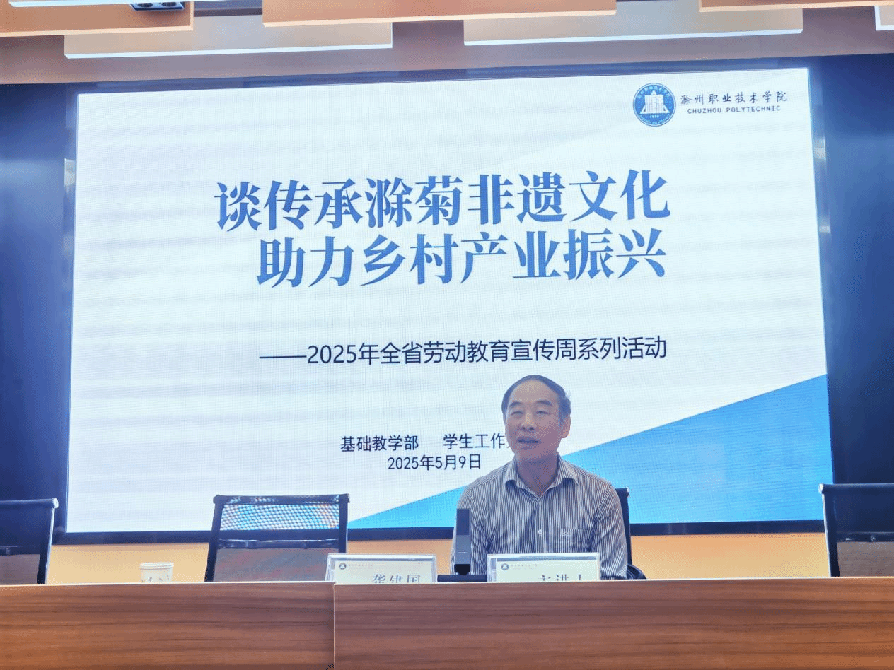 为深化2025年全省“美好生活 劳动创造”学生劳动教育宣传周主题内涵,5月9日,全国先进工作者、安徽省先进工作者、安徽省人大代表、滁菊研究所所长龚建国和安徽省劳动模范、滁州市道德模范刘晓翠受邀走进beat365,为学生作“谈传承滁菊非遗文化,助力乡村产业振兴”的主题讲座。讲座由基础教学部和学生工作处共同主办,通过“大师进校园”的形式,将劳动教育与非遗传承、乡村振兴深度融合。讲座由基础教学部副主任刘杰主持,党总支书记薛天飞出席讲座。基础教学部教师代表和食环学院学生代表聆听了讲座。