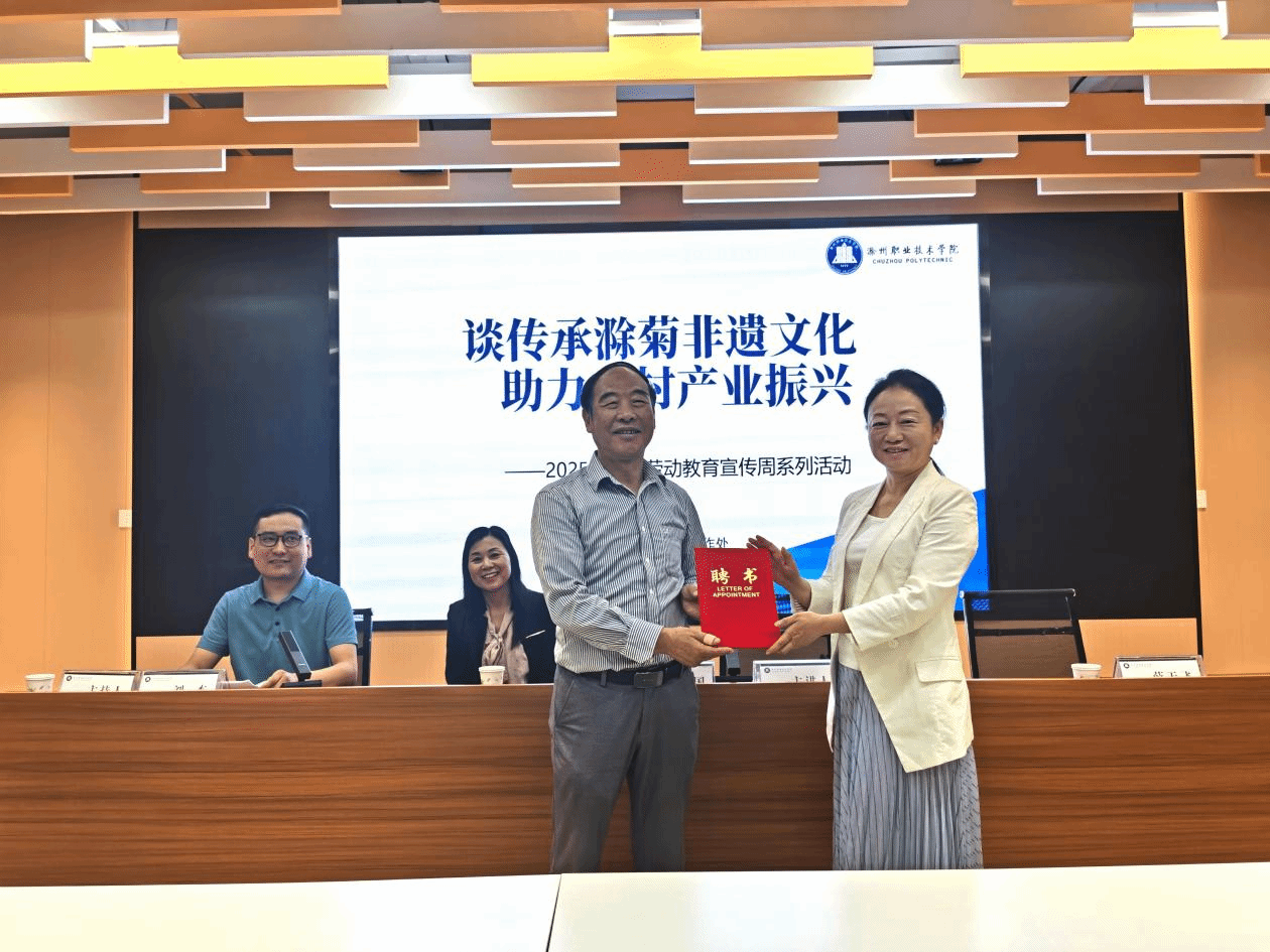 龚建国同志以滁菊制作技艺的千年传承为切入点,从植株高低、开花期、色泽、花瓣直径与层次等角度全面介绍滁菊,深入浅出地讲述了其“贡品菊花”“非遗产业”的蝶变之路。他指出,滁菊采收需手工摘取,历经避晒晾花、杀青揉形、烘干灭菌等7道工序,每一朵花的绽放都凝结着劳动者的智慧与汗水。结合自身30余年扎根基层推广滁菊种植技术的经历,他以“路虽远行则将至,事虽难做则必成”勉励与会学子牢固树立正确的劳动观念,积极扎根大地,持续提高劳动能力,深刻领会“幸福是奋斗出来的”时代内涵与意义。现场,基础教学部聘任龚建国为客座教授并颁发了聘书。