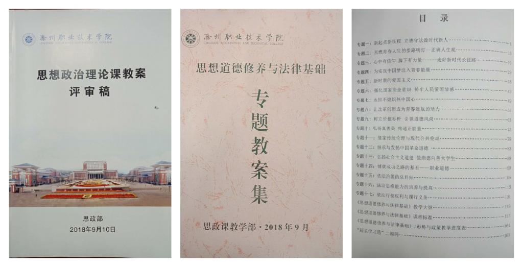 思政理论课由教材体系转化为教学体系是高校思政课教师整个教学设计和教学过程的再现,它不仅体现了教案设计要求、教学目的、教学内容和教学过程,而且是教师针对不同教学内容进行安排和设计思路的反映。因此,教师在备课过程中围绕“三贴近”将理论和实际紧密结合起来的智慧结晶,集中体现了教师的备课过程和备课内容准备情况。在整个教学过程中,教师将根据学生实际、教学内容二者的有机统一,对理论知识进行详略得当的讲授。本次备课活动针对的是新版即2018年版《思想道德修养与法律基础》课程,教师依照事前分工,按章节进行备课汇报。每位教师结合教材内容及社会热点进行了分析整理,再收集整理新思想新理论学习领会,融入教学体系中,写就专题教案。思政部汇总编辑胶印后邀请校内外专家进行评审,最终制作成专题教案集,并讨论借鉴制定了“教学大纲”和“课程标准”及相应的教学进度表。