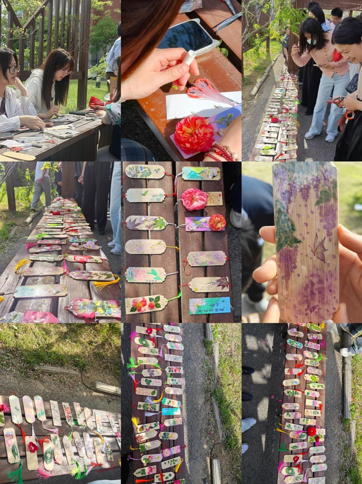 活动伊始,大家漫步在校园中,拾捡樱花、玉兰、山茶花、紫藤萝等春日素材,在绿意盎然、繁花似锦中寻找创作灵感。随后在紫藤长廊进行书签创作,在手工创作环节,学生将“春风拂过,万物萌动,处处充满生机”“簪花踏青”等诗句誊写于素笺,或绘制春日图案,让书签承载春日的诗意与哲理,实现优秀传统文化与现代设计巧妙结合。活动现场还特邀专业教师现场指导,让学生们在绘画、压花、拼贴等基础技法上叠加创意深度。