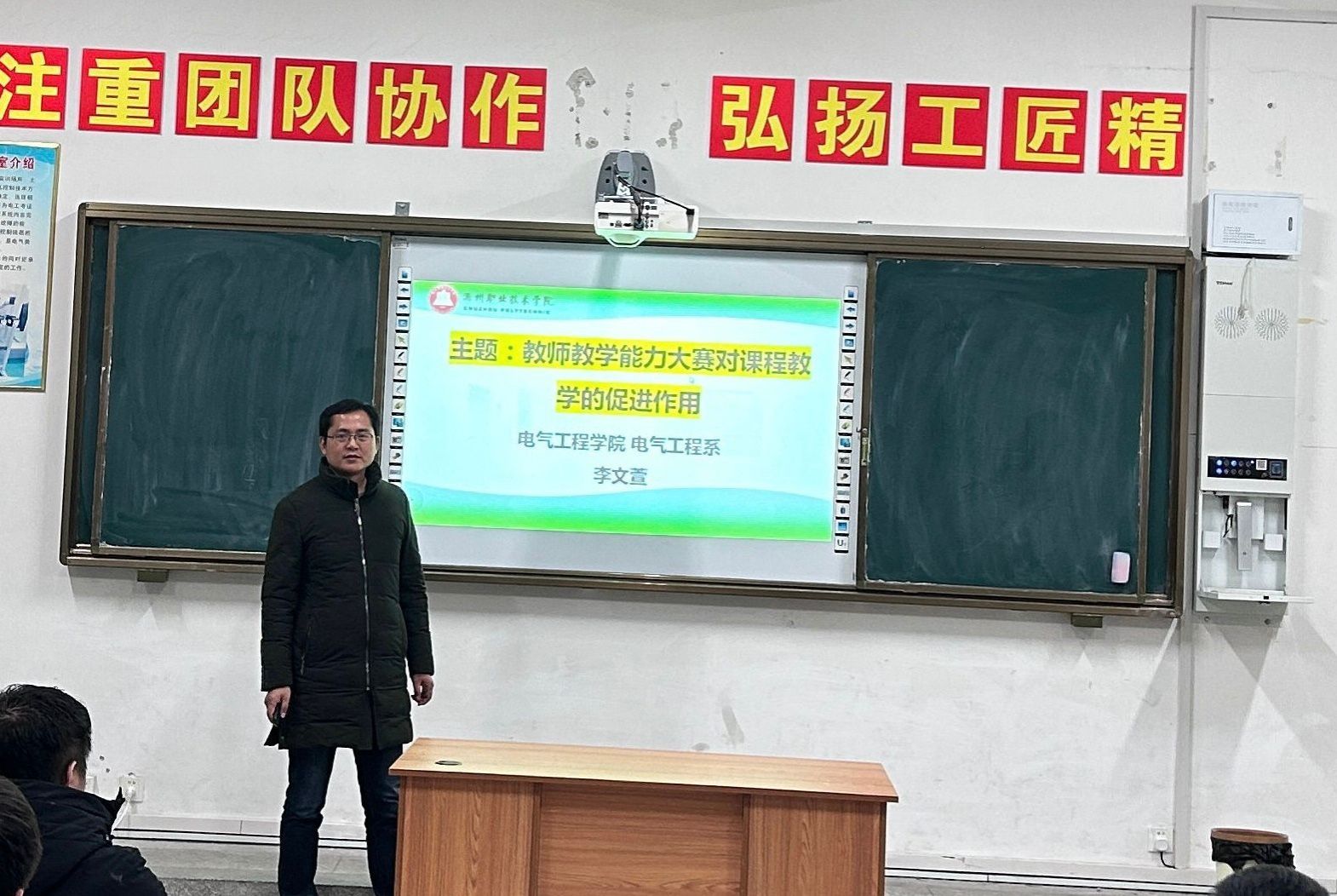 12月26日上午,电气工程学院电气工程系李文萱副教授在7N305电气控制实验室作题为“教师教学能力大赛对课程教学的促进作用”专题讲座,21电气自动化班和21机电一体化专业的部分学生参加了讲座。