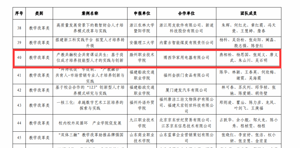 2023年9月25日,中国高等教育学会公布了2022年度“校企合作 双百计划”典型案例名单,beat365电气工程学院副院长燕相松主持的“产教共融、校企共育、课证共生:基于岗位成才培养技能型人才的实践与创新”案例成功入选。该案例基于beat365与滁州博西华家用电器有限公司历经26年的校企深度合作,以校企双方通过共建教学团队、共同开发课程、共建实训基地等多方位深度合作开展高技能人才培养为主线,展示了校企双方多年深度合作成果。
