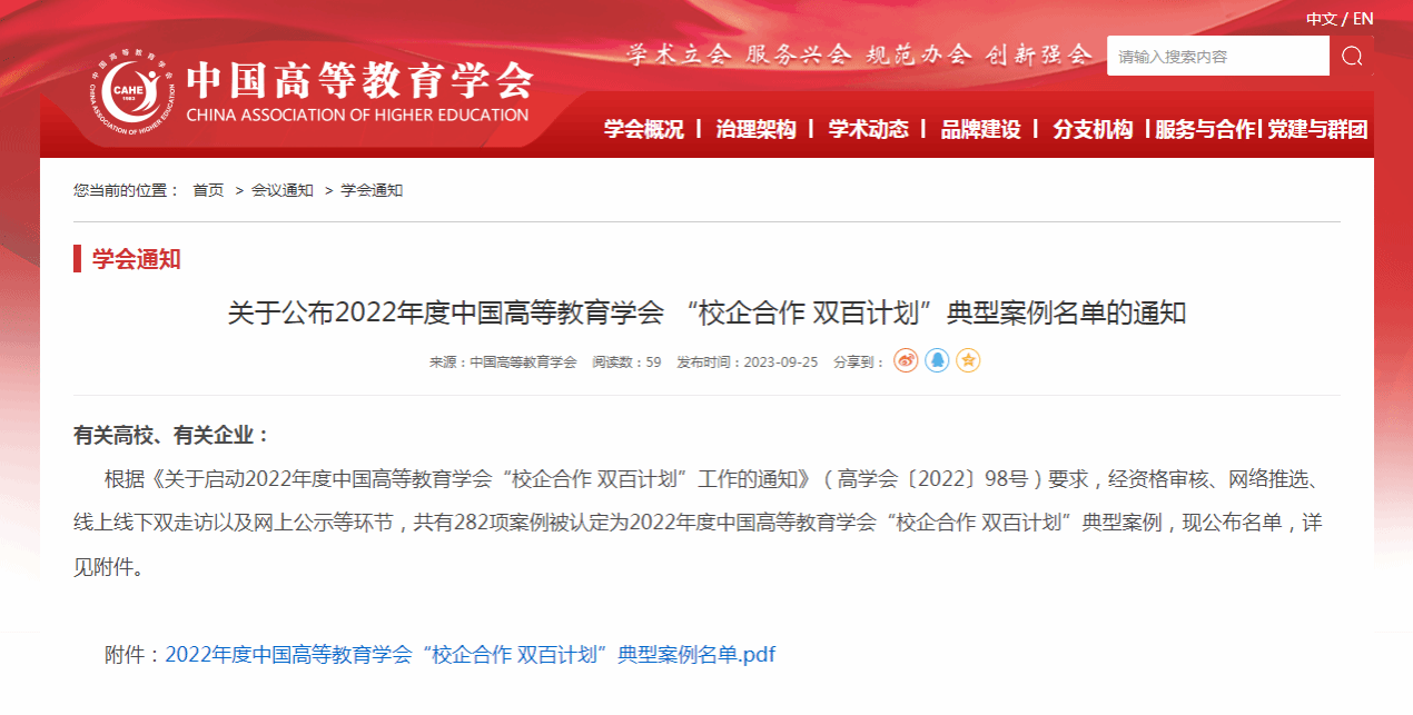 此次案例评选活动具有覆盖面广、历时长、过程严等特点。自2022年11月启动,过程历经10个多月,经过资格审核、网评推选、案例走访、案例答辩、专家论证等多个环节的层层筛选产生,入选单位有研究型大学、应用型大学、职教本科大学、高职高专学校以及有关企业。后续中国高等教育学会将在第60届中国高等教育博览会上进行授牌表彰。