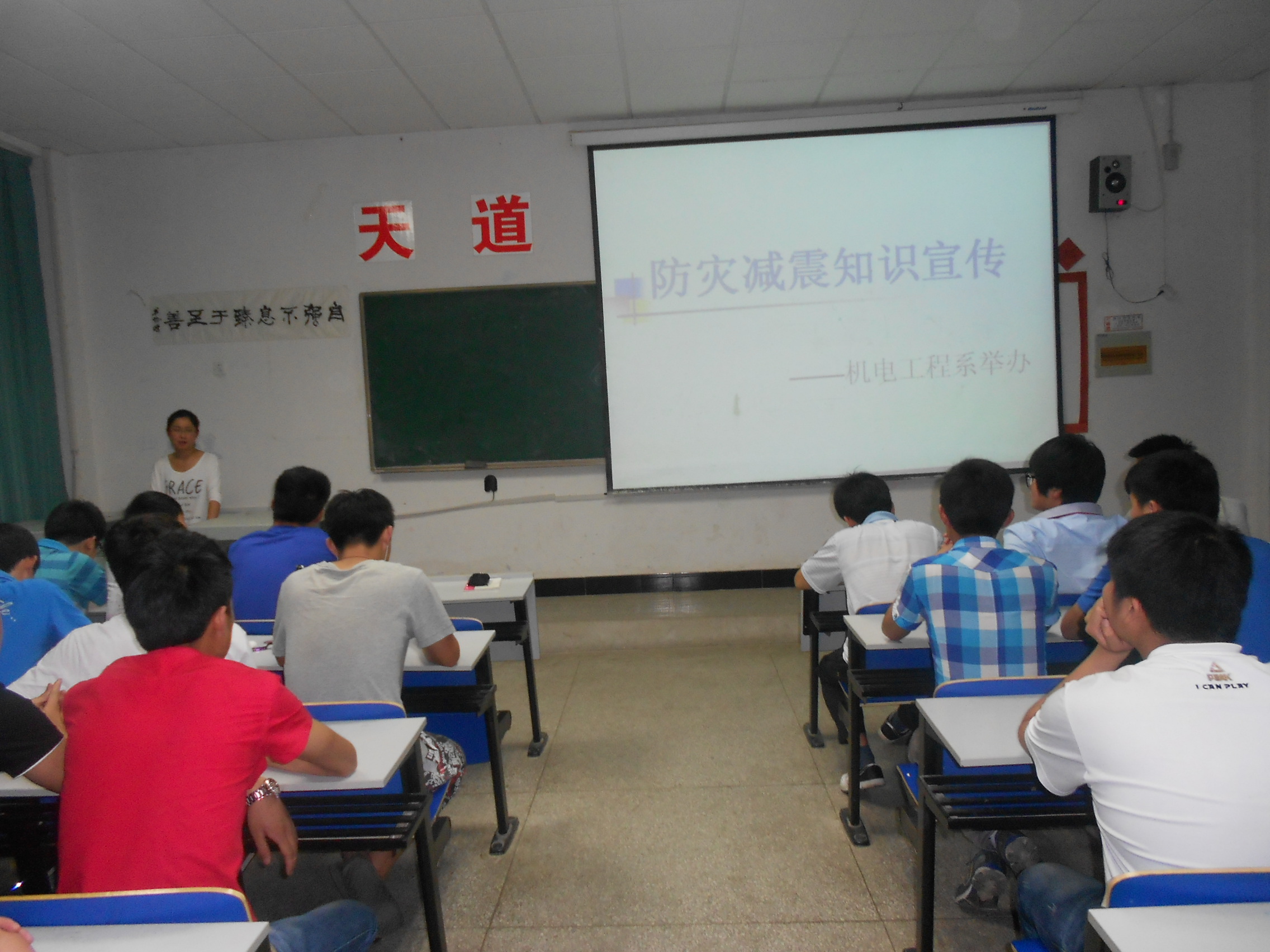 为引起同学们对防震减灾相关知识的高度关注,增强防震减灾意识,2013年5月28日晚7点,机电工程系在5113教室举办了防震减灾知识宣传活动,本次活动由我系学生会主席李娜主持,各班同学积极参与。