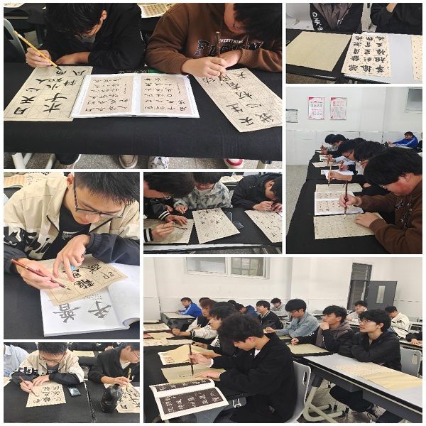 在活动开始之前,由崔文兵,刘靖同学用毛笔在黑板上做文字示范,以直观教学的方式使我院学生初步了解毛笔的使用方法以及文字的书写技巧。教学完成后,参加活动的学生们纷纷用毛笔在纸上进行文字的书写。活动中,所有学生积极参与,热情创作,充分发挥自己的兴趣爱好,每一位同学都书写出自己独特的风格。与此同时,一些同学对于陌生困难的笔画也向刘靖、崔文兵请教,整个过程中充分体现出我院学子对于书法的兴趣以及学习的积极性。活动最后,同学们都完成了自己的书法创作,虽然每一个作品都有自己独特的风格,但都充分的体现了每个学生的创作激情和对于书法的不同理解,在一定程度上提高了书法的创作技巧和水平。