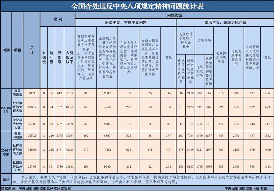 4月28日,中央纪委国家监委公布了2024年3月全国查处违反中央八项规定精神问题汇总情况。当月,全国共查处违反中央八项规定精神问题7859起,批评教育和处理10855人,其中党纪政务处分7450人,这是连续第127个月公布月报数据。